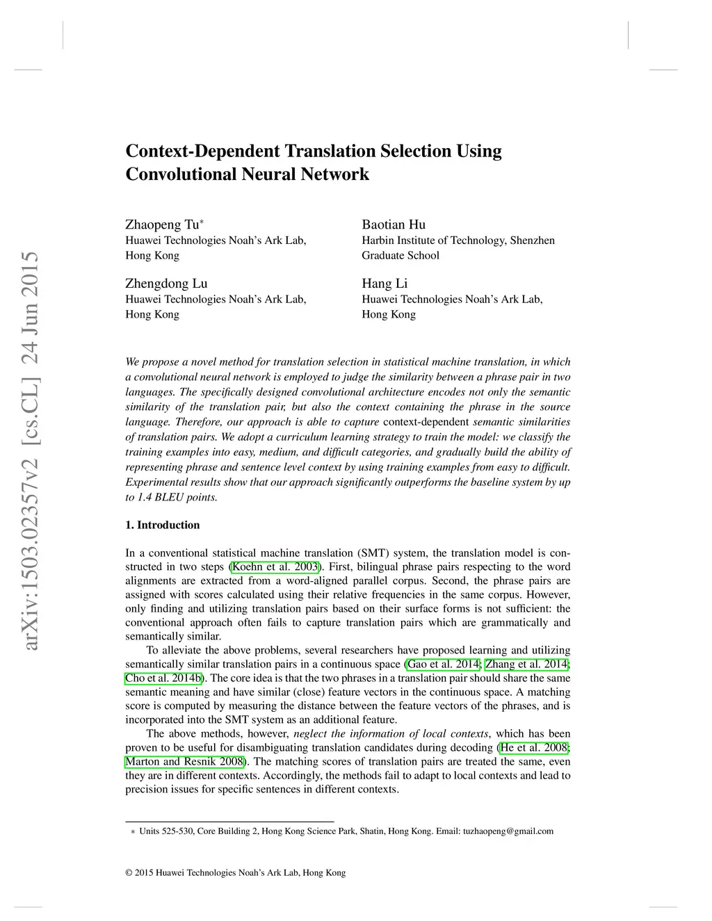 We propose a novel method for translation selection in statistical machine translation, in which a convolutional neural network is employed to judge the similarity between a phrase pair in two languages. The specifically designed convolutional architecture encodes not only the semantic similarity of the translation pair, but also the context containing the phrase in the source language. Therefore, our approach is able to capture context-dependent semantic similarities of translation pairs. We adopt a curriculum learning strategy to train the model: we classify the training examples into easy, medium, and difficult categories, and gradually build the ability of representing phrase and sentence level context by using training examples from easy to difficult. Experimental results show that our approach significantly outperforms the baseline system by up to 1.4 BLEU points.