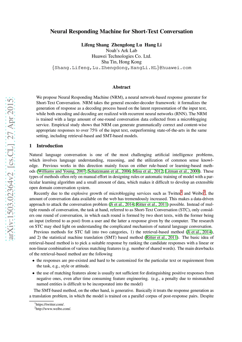We propose Neural Responding Machine (NRM), a neural network-based response generator for Short-Text Conversation. NRM takes the general encoder-decoder framework: it formalizes the generation of response as a decoding process based on the latent representation of the input text, while both encoding and decoding are realized with recurrent neural networks (RNN). The NRM is trained with a large amount of one-round conversation data collected from a microblogging service. Empirical study shows that NRM can generate grammatically correct and content-wise appropriate responses to over 75% of the input text, outperforming state-of-the-arts in the same setting, including retrieval-based and SMT-based models.
