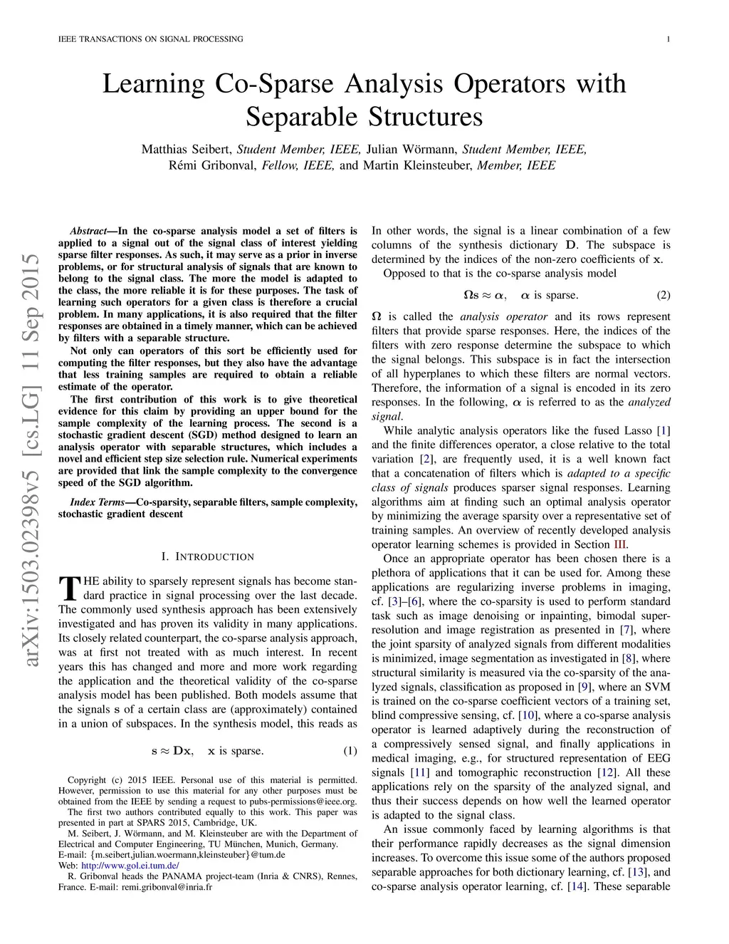 In the co-sparse analysis model a set of filters is applied to a signal out of the signal class of interest yielding sparse filter responses. As such, it may serve as a prior in inverse problems, or for structural analysis of signals that are known to belong to the signal class. The more the model is adapted to the class, the more reliable it is for these purposes. The task of learning such operators for a given class is therefore a crucial problem. In many applications, it is also required that the filter responses are obtained in a timely manner, which can be achieved by filters with a separable structure. Not only can operators of this sort be efficiently used for computing the filter responses, but they also have the advantage that less training samples are required to obtain a reliable estimate of the operator. The first contribution of this work is to give theoretical evidence for this claim by providing an upper bound for the sample complexity of the learning process. The second is a stochastic gradient descent (SGD) method designed to learn an analysis operator with separable structures, which includes a novel and efficient step size selection rule. Numerical experiments are provided that link the sample complexity to the convergence speed of the SGD algorithm.