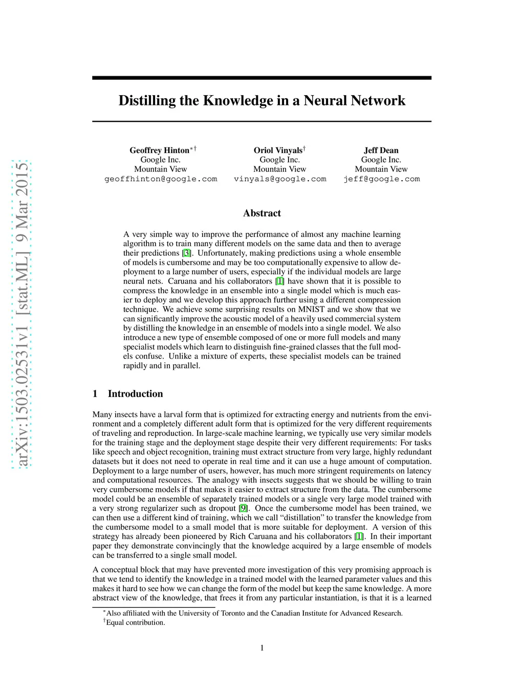 A very simple way to improve the performance of almost any machine learning algorithm is to train many different models on the same data and then to average their predictions. Unfortunately, making predictions using a whole ensemble of models is cumbersome and may be too computationally expensive to allow deployment to a large number of users, especially if the individual models are large neural nets. Caruana and his collaborators have shown that it is possible to compress the knowledge in an ensemble into a single model which is much easier to deploy and we develop this approach further using a different compression technique. We achieve some surprising results on MNIST and we show that we can significantly improve the acoustic model of a heavily used commercial system by distilling the knowledge in an ensemble of models into a single model. We also introduce a new type of ensemble composed of one or more full models and many specialist models which learn to distinguish fine-grained classes that the full models confuse. Unlike a mixture of experts, these specialist models can be trained rapidly and in parallel.