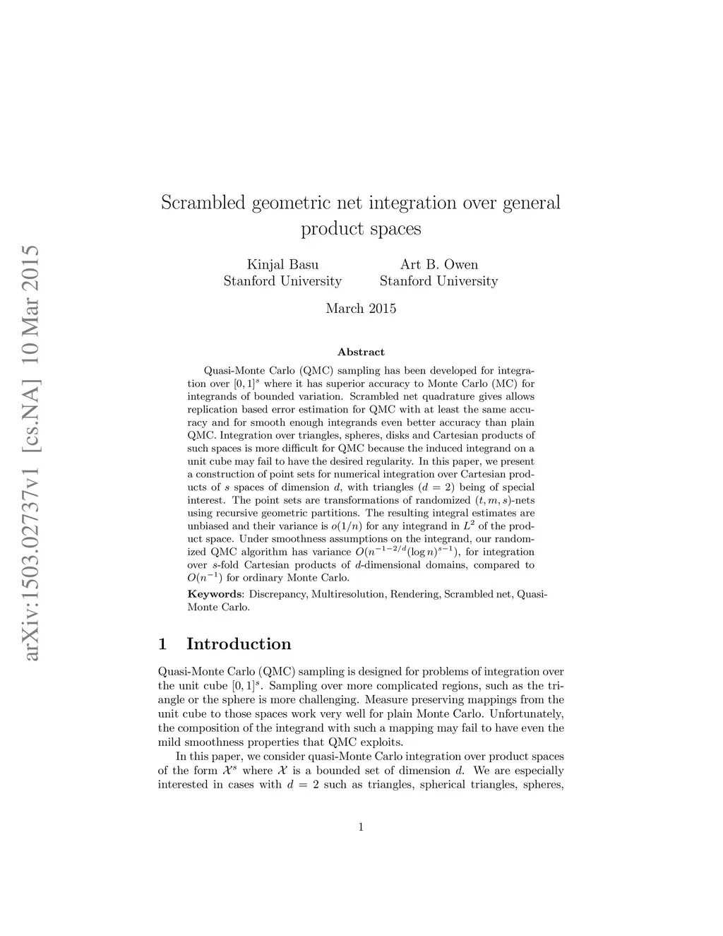Quasi-Monte Carlo (QMC) sampling has been developed for integration over where it has superior accuracy to Monte Carlo (MC) for integrands of bounded variation. Scrambled net quadrature gives allows replication based error estimation for QMC with at least the same accuracy and for smooth enough integrands even better accuracy than plain QMC. Integration over triangles, spheres, disks and Cartesian products of such spaces is more difficult for QMC because the induced integrand on a unit cube may fail to have the desired regularity. In this paper, we present a construction of point sets for numerical integration over Cartesian products of spaces of dimension , with triangles () being of special interest. The point sets are transformations of randomized -nets using recursive geometric partitions. The resulting integral estimates are unbiased and their variance is for any integrand in of the product space. Under smoothness assumptions on the integrand, our randomized QMC algorithm has variance , for integration over -fold Cartesian products of -dimensional domains, compared to for ordinary Monte Carlo.