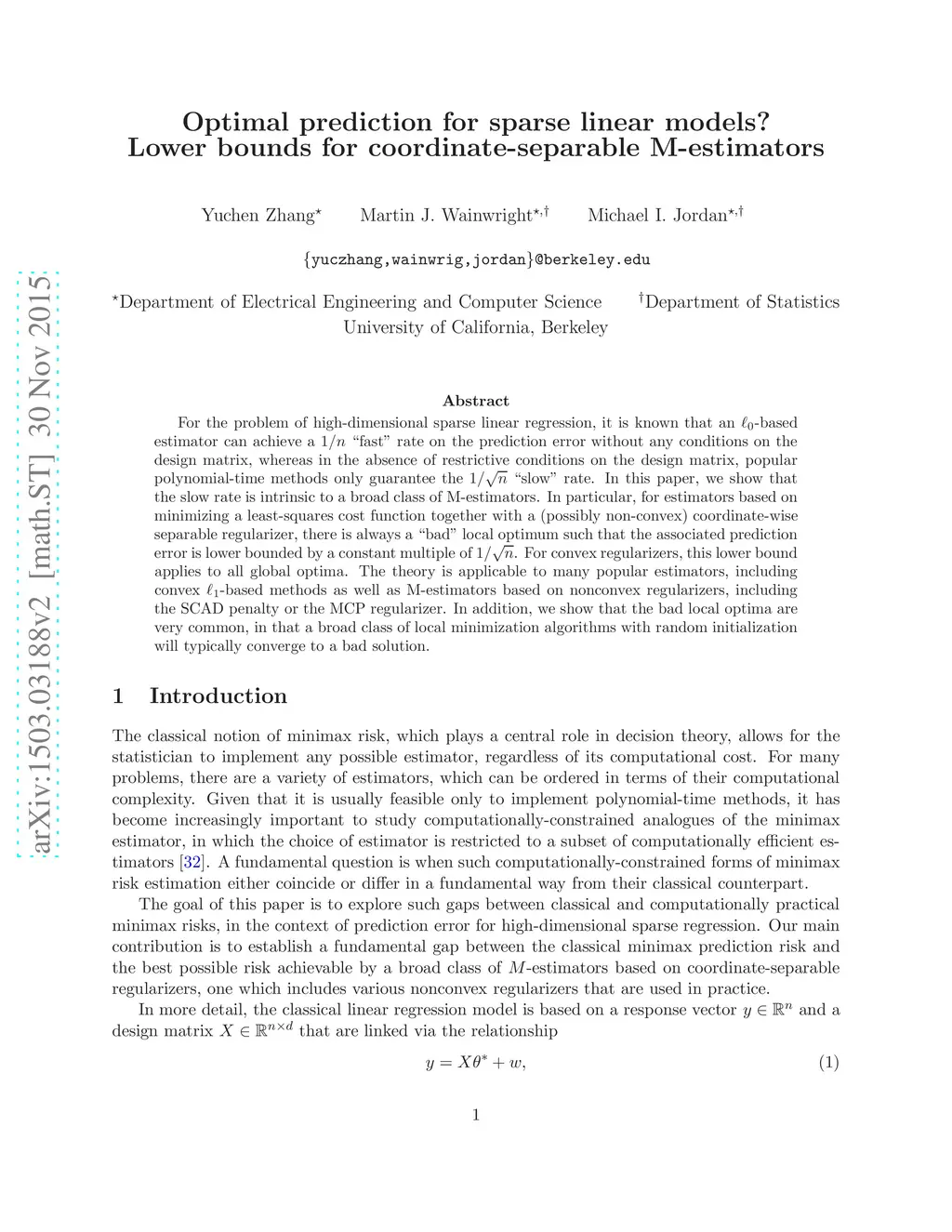 For the problem of high-dimensional sparse linear regression, it is known that an -based estimator can achieve a "fast" rate on the prediction error without any conditions on the design matrix, whereas in absence of restrictive conditions on the design matrix, popular polynomial-time methods only guarantee the "slow" rate. In this paper, we show that the slow rate is intrinsic to a broad class of M-estimators. In particular, for estimators based on minimizing a least-squares cost function together with a (possibly non-convex) coordinate-wise separable regularizer, there is always a "bad" local optimum such that the associated prediction error is lower bounded by a constant multiple of . For convex regularizers, this lower bound applies to all global optima. The theory is applicable to many popular estimators, including convex -based methods as well as M-estimators based on nonconvex regularizers, including the SCAD penalty or the MCP regularizer. In addition, for a broad class of nonconvex regularizers, we show that the bad local optima are very common, in that a broad class of local minimization algorithms with random initialization will typically converge to a bad solution.