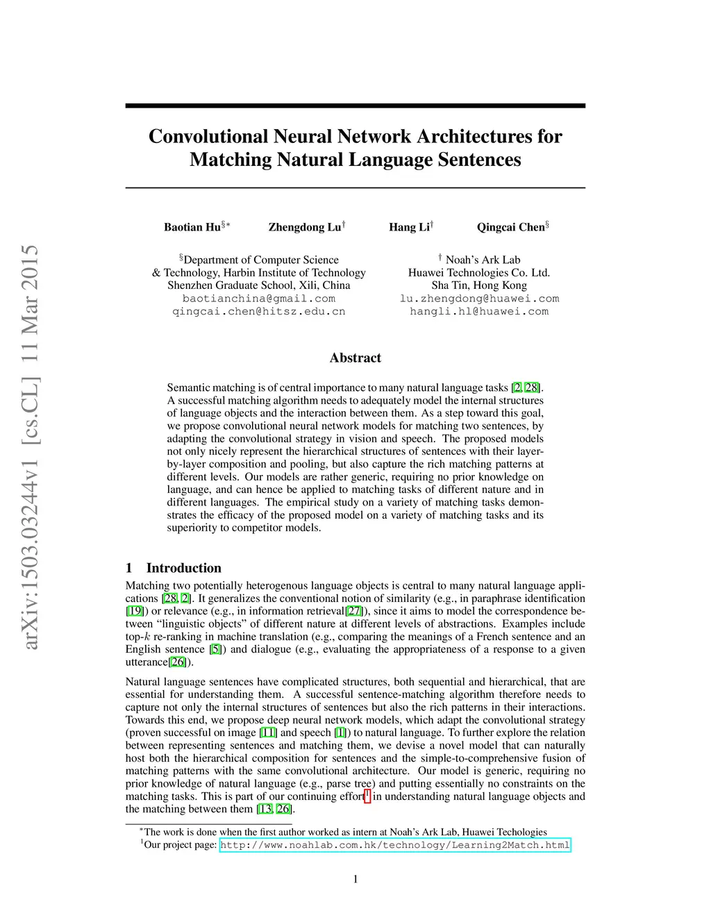 Semantic matching is of central importance to many natural language tasks \cite{bordes2014semantic,RetrievalQA}. A successful matching algorithm needs to adequately model the internal structures of language objects and the interaction between them. As a step toward this goal, we propose convolutional neural network models for matching two sentences, by adapting the convolutional strategy in vision and speech. The proposed models not only nicely represent the hierarchical structures of sentences with their layer-by-layer composition and pooling, but also capture the rich matching patterns at different levels. Our models are rather generic, requiring no prior knowledge on language, and can hence be applied to matching tasks of different nature and in different languages. The empirical study on a variety of matching tasks demonstrates the efficacy of the proposed model on a variety of matching tasks and its superiority to competitor models.