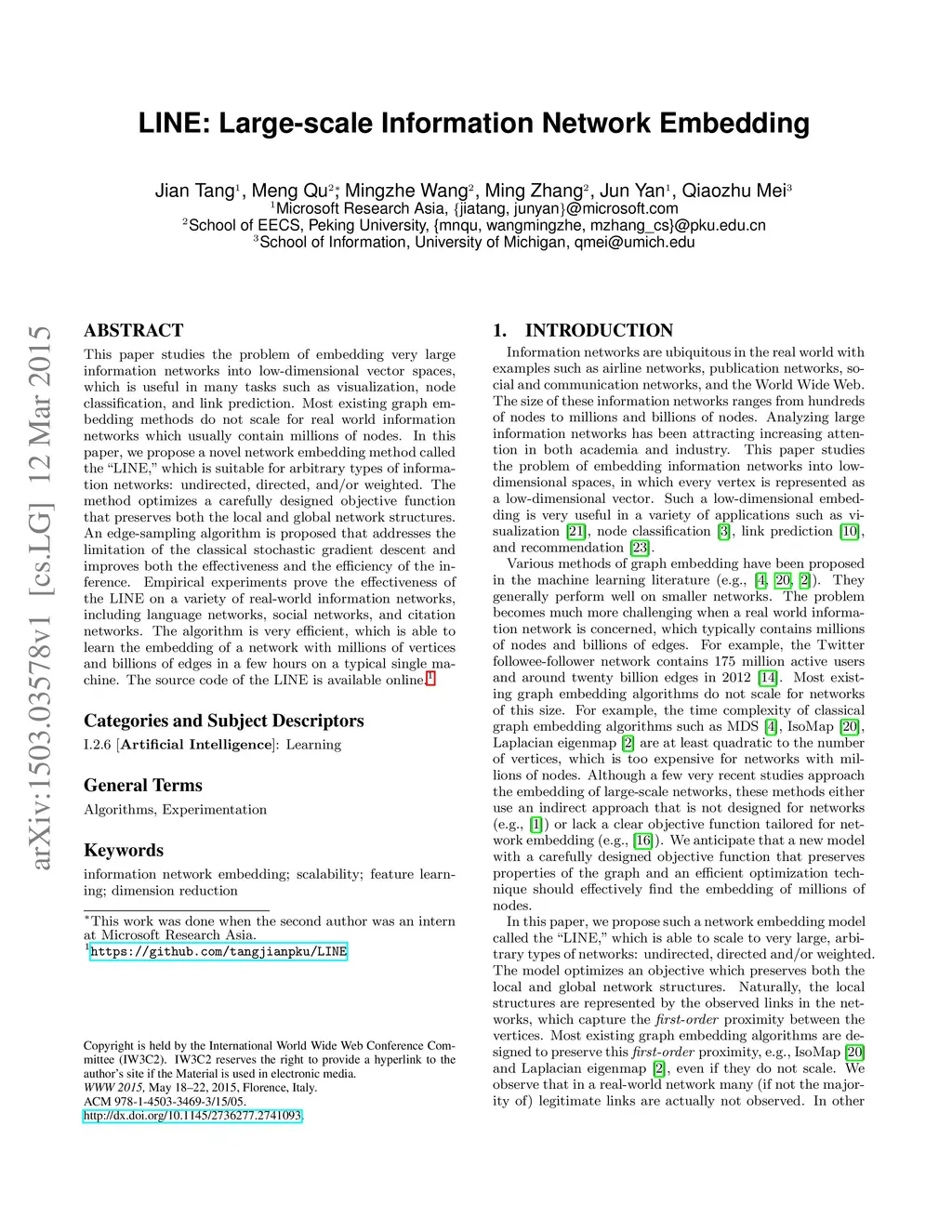 This paper studies the problem of embedding very large information networks into low-dimensional vector spaces, which is useful in many tasks such as visualization, node classification, and link prediction. Most existing graph embedding methods do not scale for real world information networks which usually contain millions of nodes. In this paper, we propose a novel network embedding method called the "LINE," which is suitable for arbitrary types of information networks: undirected, directed, and/or weighted. The method optimizes a carefully designed objective function that preserves both the local and global network structures. An edge-sampling algorithm is proposed that addresses the limitation of the classical stochastic gradient descent and improves both the effectiveness and the efficiency of the inference. Empirical experiments prove the effectiveness of the LINE on a variety of real-world information networks, including language networks, social networks, and citation networks. The algorithm is very efficient, which is able to learn the embedding of a network with millions of vertices and billions of edges in a few hours on a typical single machine. The source code of the LINE is available online.