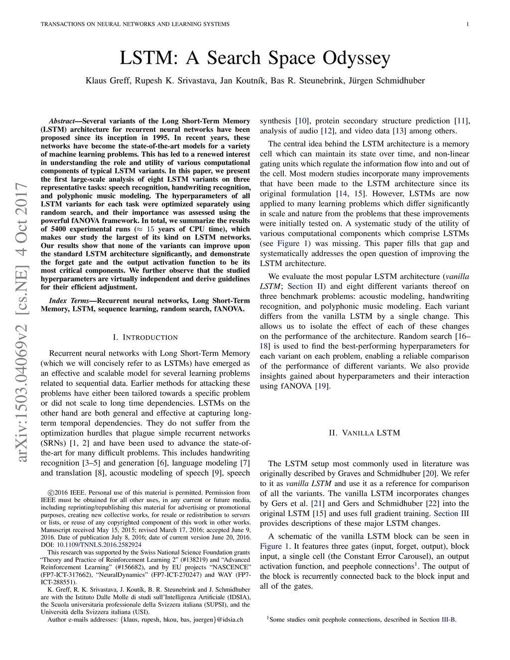 Several variants of the Long Short-Term Memory (LSTM) architecture for recurrent neural networks have been proposed since its inception in 1995. In recent years, these networks have become the state-of-the-art models for a variety of machine learning problems. This has led to a renewed interest in understanding the role and utility of various computational components of typical LSTM variants. In this paper, we present the first large-scale analysis of eight LSTM variants on three representative tasks: speech recognition, handwriting recognition, and polyphonic music modeling. The hyperparameters of all LSTM variants for each task were optimized separately using random search, and their importance was assessed using the powerful fANOVA framework. In total, we summarize the results of 5400 experimental runs ( years of CPU time), which makes our study the largest of its kind on LSTM networks. Our results show that none of the variants can improve upon the standard LSTM architecture significantly, and demonstrate the forget gate and the output activation function to be its most critical components. We further observe that the studied hyperparameters are virtually independent and derive guidelines for their efficient adjustment.
