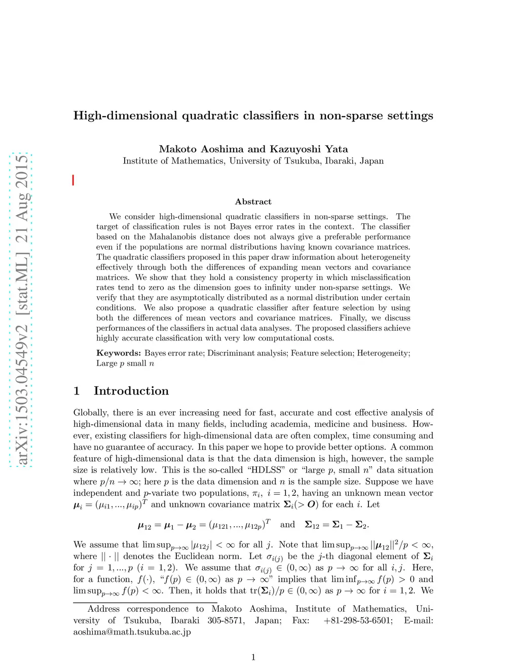 High-dimensional quadratic classifiers in non-sparse settings