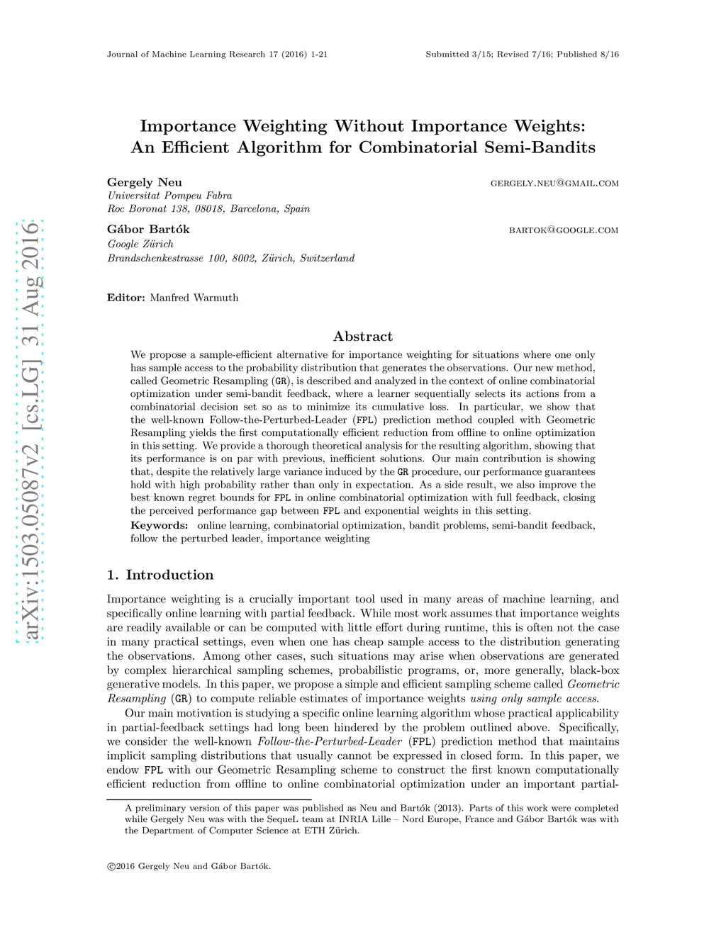 We propose a sample-efficient alternative for importance weighting for situations where one only has sample access to the probability distribution that generates the observations. Our new method, called Geometric Resampling (GR), is described and analyzed in the context of online combinatorial optimization under semi-bandit feedback, where a learner sequentially selects its actions from a combinatorial decision set so as to minimize its cumulative loss. In particular, we show that the well-known Follow-the-Perturbed-Leader (FPL) prediction method coupled with Geometric Resampling yields the first computationally efficient reduction from offline to online optimization in this setting. We provide a thorough theoretical analysis for the resulting algorithm, showing that its performance is on par with previous, inefficient solutions. Our main contribution is showing that, despite the relatively large variance induced by the GR procedure, our performance guarantees hold with high probability rather than only in expectation. As a side result, we also improve the best known regret bounds for FPL in online combinatorial optimization with full feedback, closing the perceived performance gap between FPL and exponential weights in this setting.