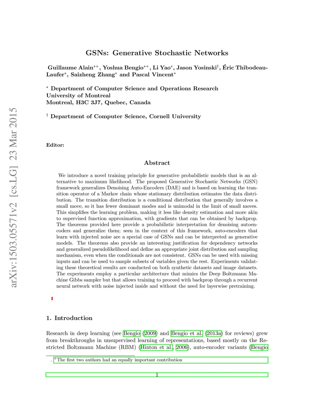 We introduce a novel training principle for probabilistic models that is an alternative to maximum likelihood. The proposed Generative Stochastic Networks (GSN) framework is based on learning the transition operator of a Markov chain whose stationary distribution estimates the data distribution. Because the transition distribution is a conditional distribution generally involving a small move, it has fewer dominant modes, being unimodal in the limit of small moves. Thus, it is easier to learn, more like learning to perform supervised function approximation, with gradients that can be obtained by back-propagation. The theorems provided here generalize recent work on the probabilistic interpretation of denoising auto-encoders and provide an interesting justification for dependency networks and generalized pseudolikelihood (along with defining an appropriate joint distribution and sampling mechanism, even when the conditionals are not consistent). We study how GSNs can be used with missing inputs and can be used to sample subsets of variables given the rest. Successful experiments are conducted, validating these theoretical results, on two image datasets and with a particular architecture that mimics the Deep Boltzmann Machine Gibbs sampler but allows training to proceed with backprop, without the need for layerwise pretraining.