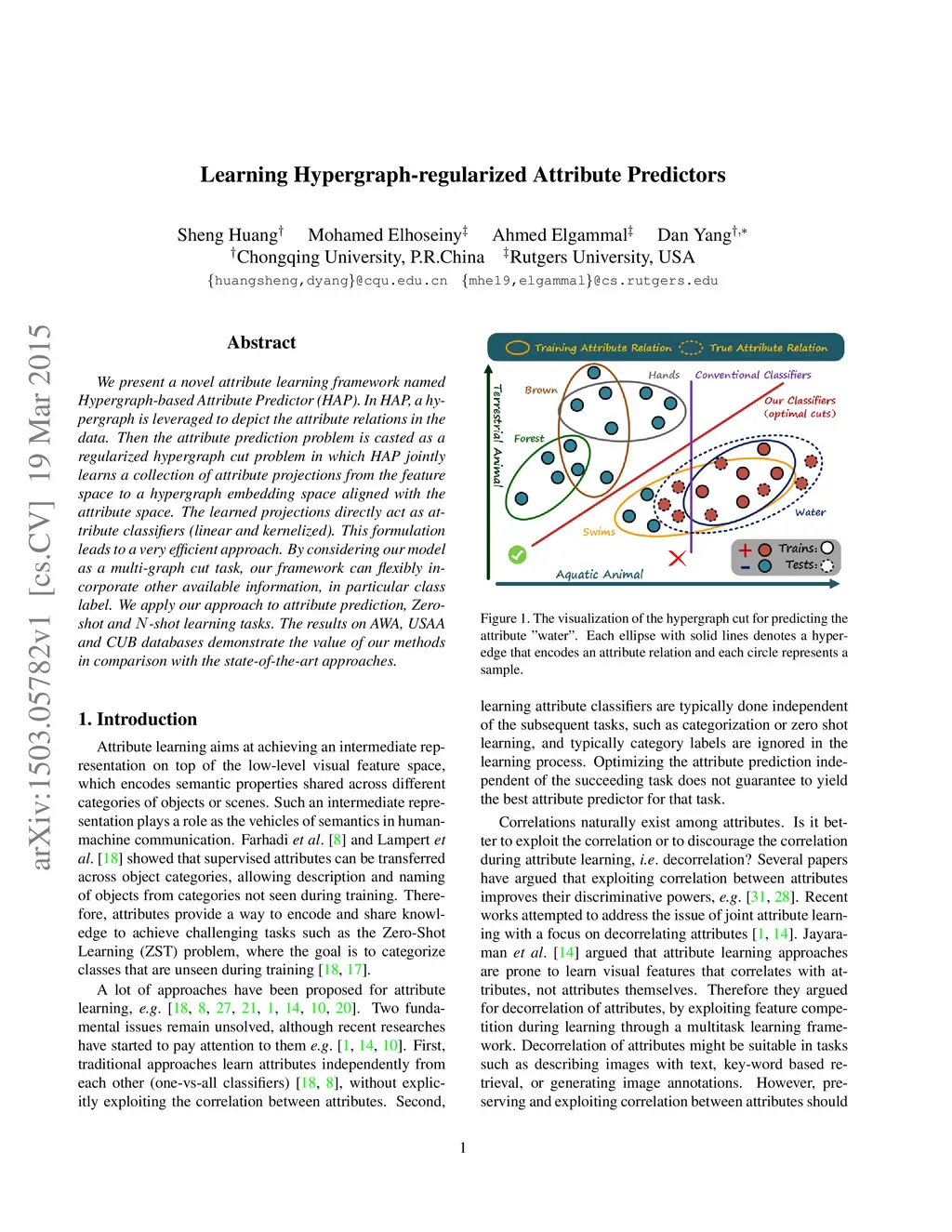 We present a novel attribute learning framework named Hypergraph-based Attribute Predictor (HAP). In HAP, a hypergraph is leveraged to depict the attribute relations in the data. Then the attribute prediction problem is casted as a regularized hypergraph cut problem in which HAP jointly learns a collection of attribute projections from the feature space to a hypergraph embedding space aligned with the attribute space. The learned projections directly act as attribute classifiers (linear and kernelized). This formulation leads to a very efficient approach. By considering our model as a multi-graph cut task, our framework can flexibly incorporate other available information, in particular class label. We apply our approach to attribute prediction, Zero-shot and -shot learning tasks. The results on AWA, USAA and CUB databases demonstrate the value of our methods in comparison with the state-of-the-art approaches.