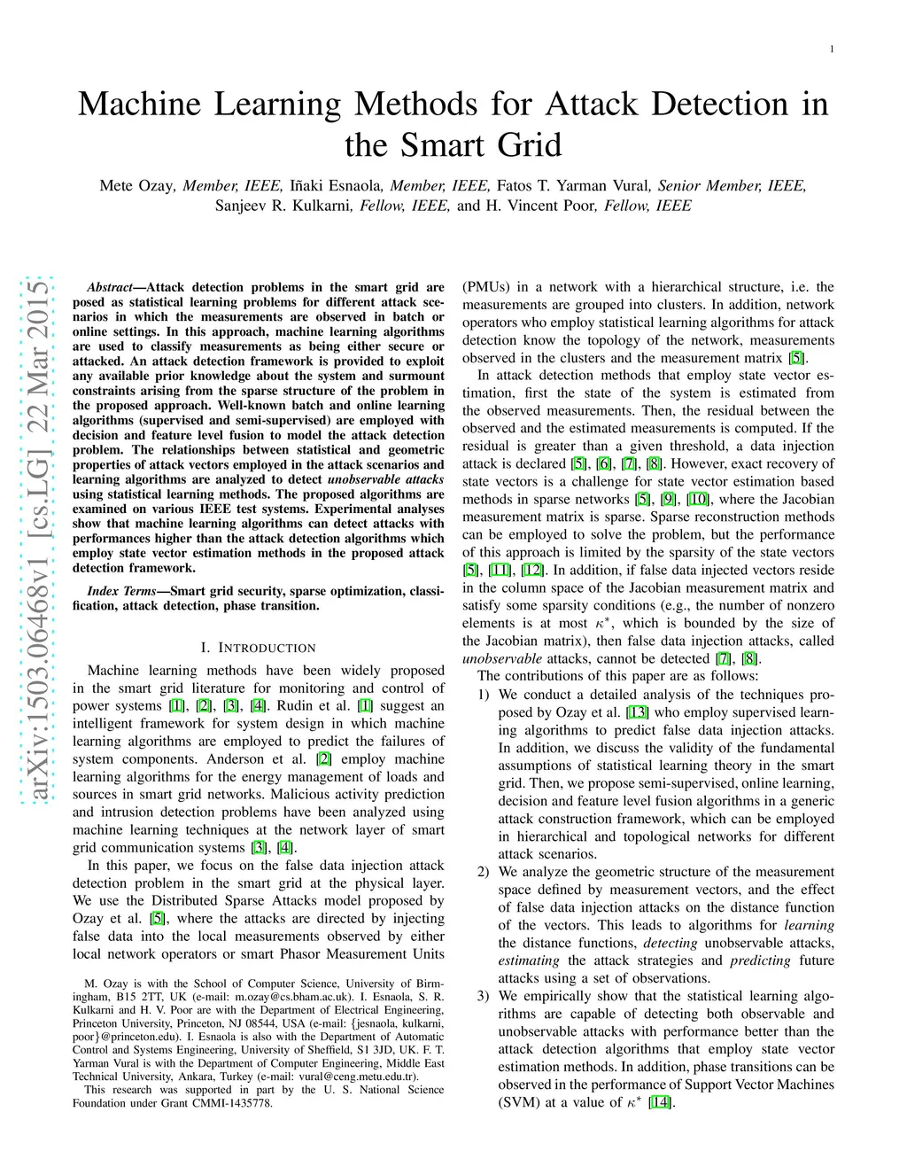 Attack detection problems in the smart grid are posed as statistical learning problems for different attack scenarios in which the measurements are observed in batch or online settings. In this approach, machine learning algorithms are used to classify measurements as being either secure or attacked. An attack detection framework is provided to exploit any available prior knowledge about the system and surmount constraints arising from the sparse structure of the problem in the proposed approach. Well-known batch and online learning algorithms (supervised and semi-supervised) are employed with decision and feature level fusion to model the attack detection problem. The relationships between statistical and geometric properties of attack vectors employed in the attack scenarios and learning algorithms are analyzed to detect unobservable attacks using statistical learning methods. The proposed algorithms are examined on various IEEE test systems. Experimental analyses show that machine learning algorithms can detect attacks with performances higher than the attack detection algorithms which employ state vector estimation methods in the proposed attack detection framework.