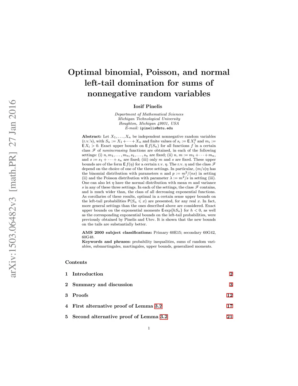 Let be independent nonnegative random variables (r.v.'s), with and finite values of and . Exact upper bounds on for all functions in a certain class of nonincreasing functions are obtained, in each of the following settings: (i) are fixed; (ii) , , and are fixed; (iii)~only and are fixed. These upper bounds are of the form for a certain r.v. . The r.v. and the class depend on the choice of one of the three settings. In particular, has the binomial distribution with parameters and in setting (ii) and the Poisson distribution with parameter in setting (iii). One can also let have the normal distribution with mean and variance in any of these three settings. In each of the settings, the class contains, and is much wider than, the class of all decreasing exponential functions. As corollaries of these results, optimal in a certain sense upper bounds on the left-tail probabilities are presented, for any real . In fact, more general settings than the ones described above are considered. Exact upper bounds on the exponential moments for , as well as the corresponding exponential bounds on the left-tail probabilities, were previously obtained by Pinelis and Utev. It is shown that the new bounds on the tails are substantially better.