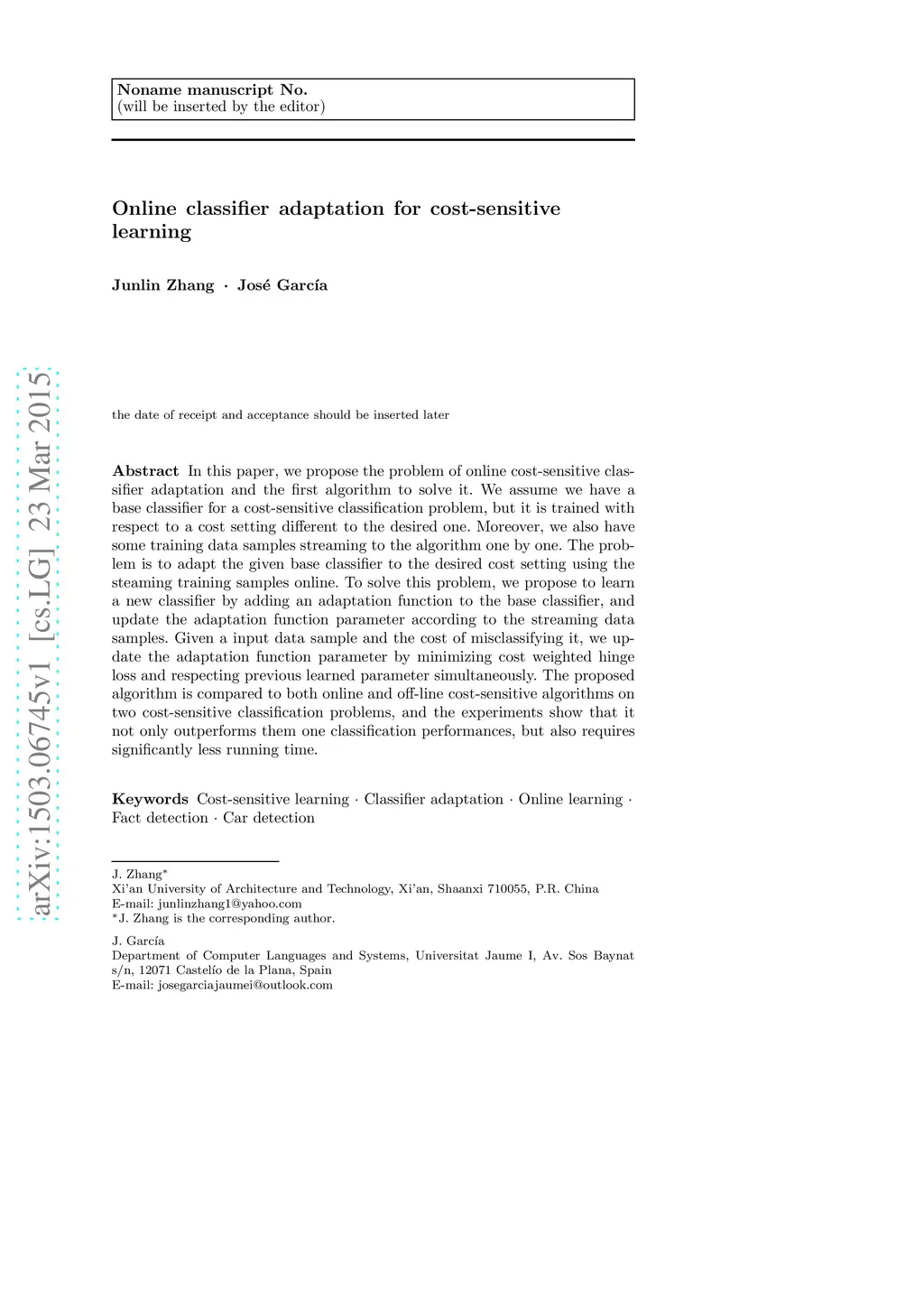 In this paper, we propose the problem of online cost-sensitive clas- sifier adaptation and the first algorithm to solve it. We assume we have a base classifier for a cost-sensitive classification problem, but it is trained with respect to a cost setting different to the desired one. Moreover, we also have some training data samples streaming to the algorithm one by one. The prob- lem is to adapt the given base classifier to the desired cost setting using the steaming training samples online. To solve this problem, we propose to learn a new classifier by adding an adaptation function to the base classifier, and update the adaptation function parameter according to the streaming data samples. Given a input data sample and the cost of misclassifying it, we up- date the adaptation function parameter by minimizing cost weighted hinge loss and respecting previous learned parameter simultaneously. The proposed algorithm is compared to both online and off-line cost-sensitive algorithms on two cost-sensitive classification problems, and the experiments show that it not only outperforms them one classification performances, but also requires significantly less running time.