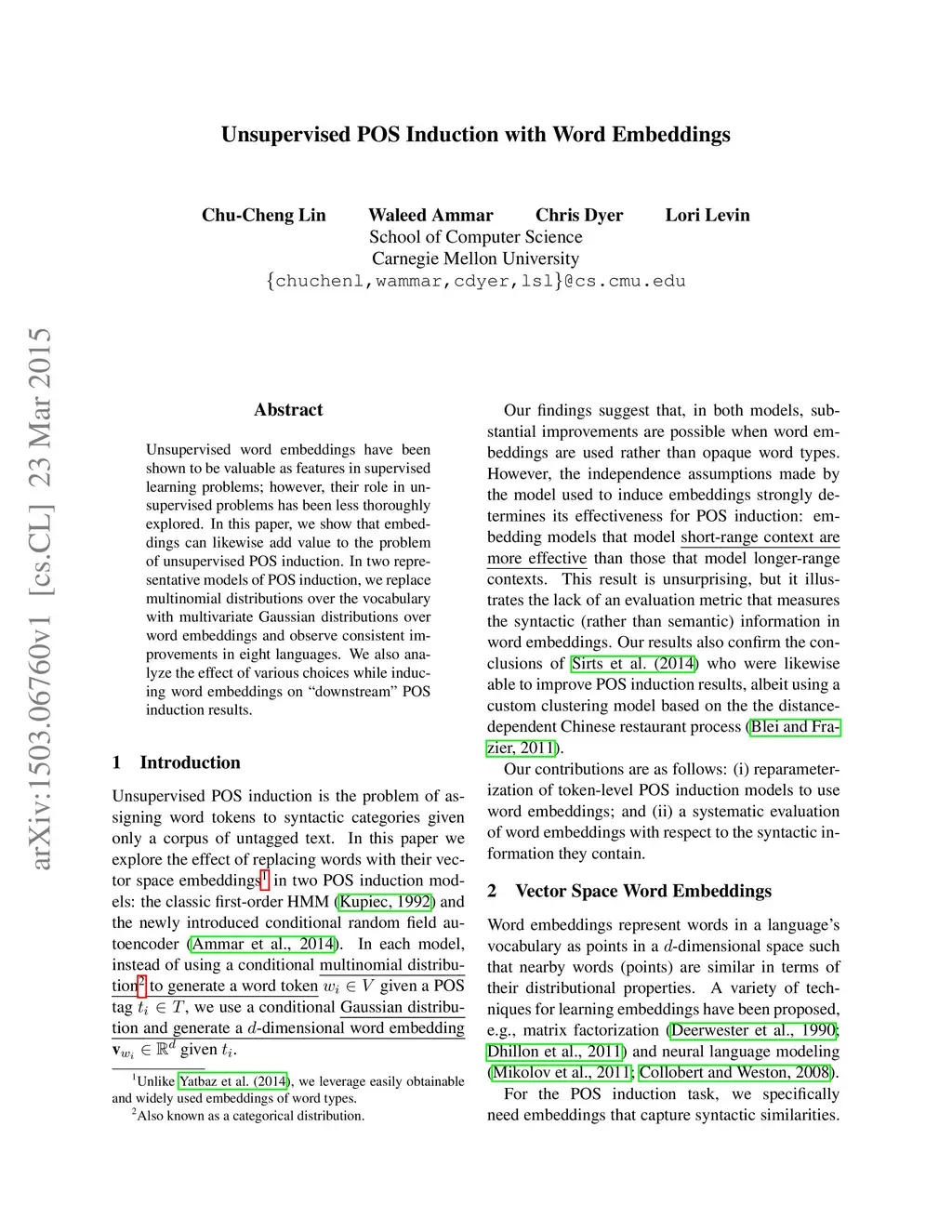 Unsupervised POS Induction with Word Embeddings