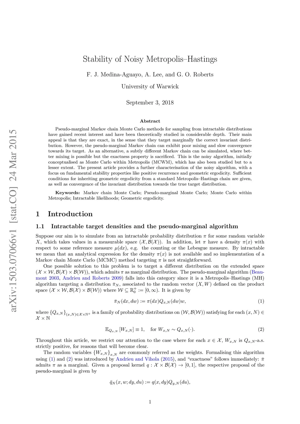 Pseudo-marginal Markov chain Monte Carlo methods for sampling from intractable distributions have gained recent interest and have been theoretically studied in considerable depth. Their main appeal is that they are exact, in the sense that they target marginally the correct invariant distribution. However, the pseudo-marginal Markov chain can exhibit poor mixing and slow convergence towards its target. As an alternative, a subtly different Markov chain can be simulated, where better mixing is possible but the exactness property is sacrificed. This is the noisy algorithm, initially conceptualised as Monte Carlo within Metropolis (MCWM), which has also been studied but to a lesser extent. The present article provides a further characterisation of the noisy algorithm, with a focus on fundamental stability properties like positive recurrence and geometric ergodicity. Sufficient conditions for inheriting geometric ergodicity from a standard Metropolis-Hastings chain are given, as well as convergence of the invariant distribution towards the true target distribution.