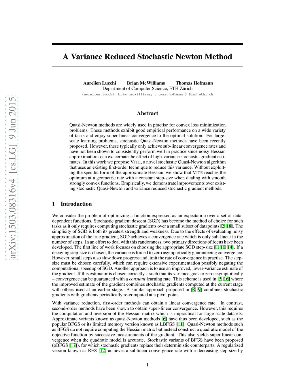 Quasi-Newton methods are widely used in practise for convex loss minimization problems. These methods exhibit good empirical performance on a wide variety of tasks and enjoy super-linear convergence to the optimal solution. For large-scale learning problems, stochastic Quasi-Newton methods have been recently proposed. However, these typically only achieve sub-linear convergence rates and have not been shown to consistently perform well in practice since noisy Hessian approximations can exacerbate the effect of high-variance stochastic gradient estimates. In this work we propose Vite, a novel stochastic Quasi-Newton algorithm that uses an existing first-order technique to reduce this variance. Without exploiting the specific form of the approximate Hessian, we show that Vite reaches the optimum at a geometric rate with a constant step-size when dealing with smooth strongly convex functions. Empirically, we demonstrate improvements over existing stochastic Quasi-Newton and variance reduced stochastic gradient methods.