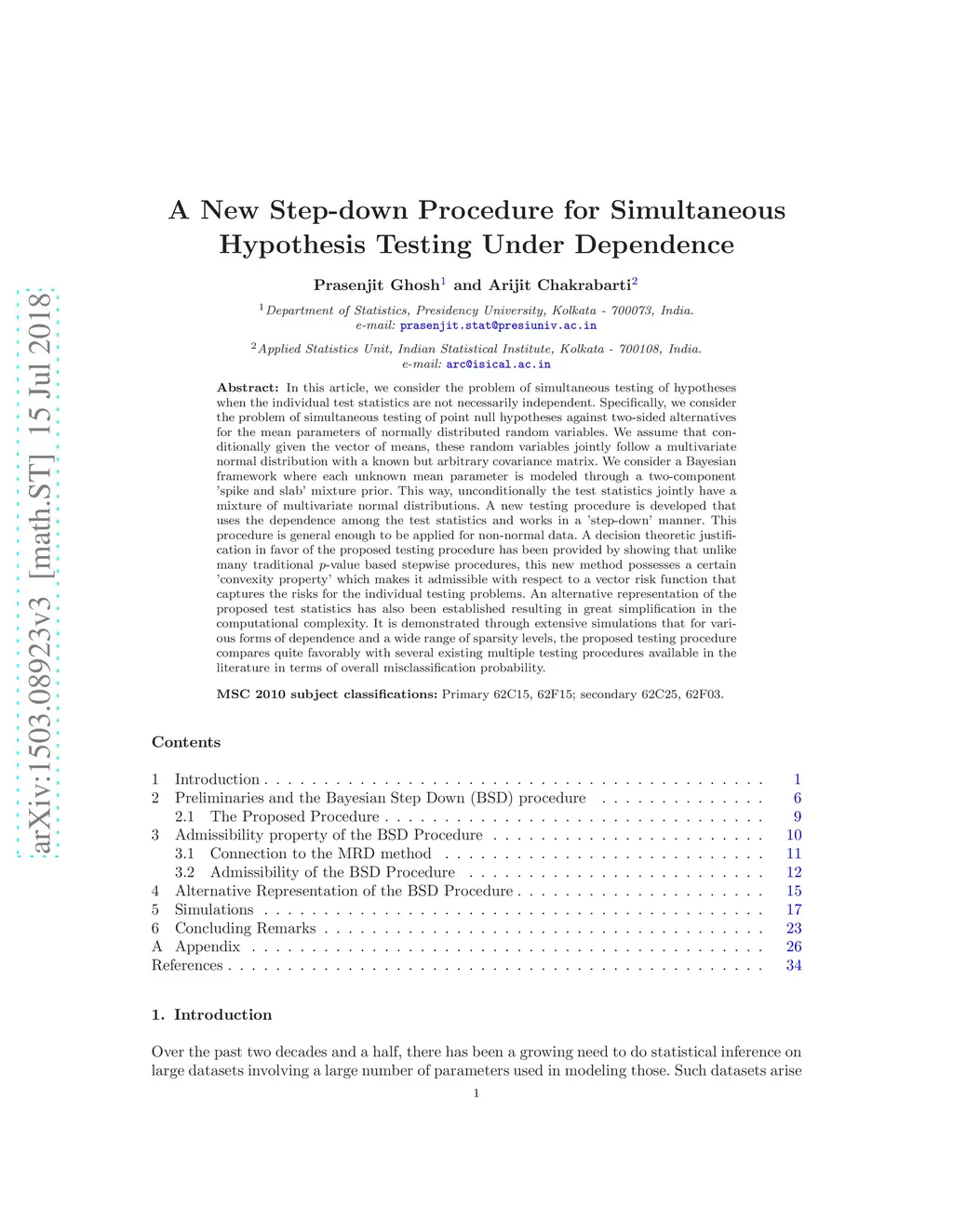 In this article, we consider the problem of simultaneous testing of hypotheses when the individual test statistics are not necessarily independent. Specifically, we consider the problem of simultaneous testing of point null hypotheses against two-sided alternatives about the mean parameters of normally distributed random variables. We assume that conditionally given the vector means, these random variables jointly follow a multivariate normal distribution with a known but arbitrary covariance matrix. We consider a Bayesian framework where each unknown mean parameter is modeled through a two-component point mass mixture prior, whereby unconditionally the test statistics jointly have a mixture of multivariate normal distributions. A new testing procedure is developed that uses the dependence among the test statistics and works in a step down like manner. This procedure is general enough to be applied to even for non-normal data. A decision theoretic justification in favor of the proposed testing procedure has been provided by showing that unlike the traditional -value based stepwise procedures, this new method possesses a certain convexity property which is essential for the admissibility of a multiple testing procedure with respect to the vector risk function. An alternative representation of the proposed test statistics has also been established resulting in a great reduction in computational complexity. It is demonstrated through extensive simulations that for various forms of dependence and a wide range of sparsity levels, the proposed testing procedure compares quite favorably with several existing multiple testing procedures available in the literature in terms of overall misclassification probability.