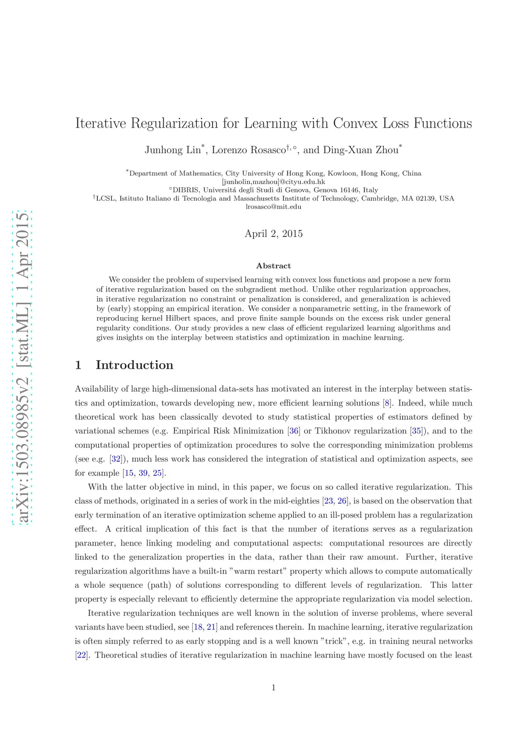 We consider the problem of supervised learning with convex loss functions and propose a new form of iterative regularization based on the subgradient method. Unlike other regularization approaches, in iterative regularization no constraint or penalization is considered, and generalization is achieved by (early) stopping an empirical iteration. We consider a nonparametric setting, in the framework of reproducing kernel Hilbert spaces, and prove finite sample bounds on the excess risk under general regularity conditions. Our study provides a new class of efficient regularized learning algorithms and gives insights on the interplay between statistics and optimization in machine learning.