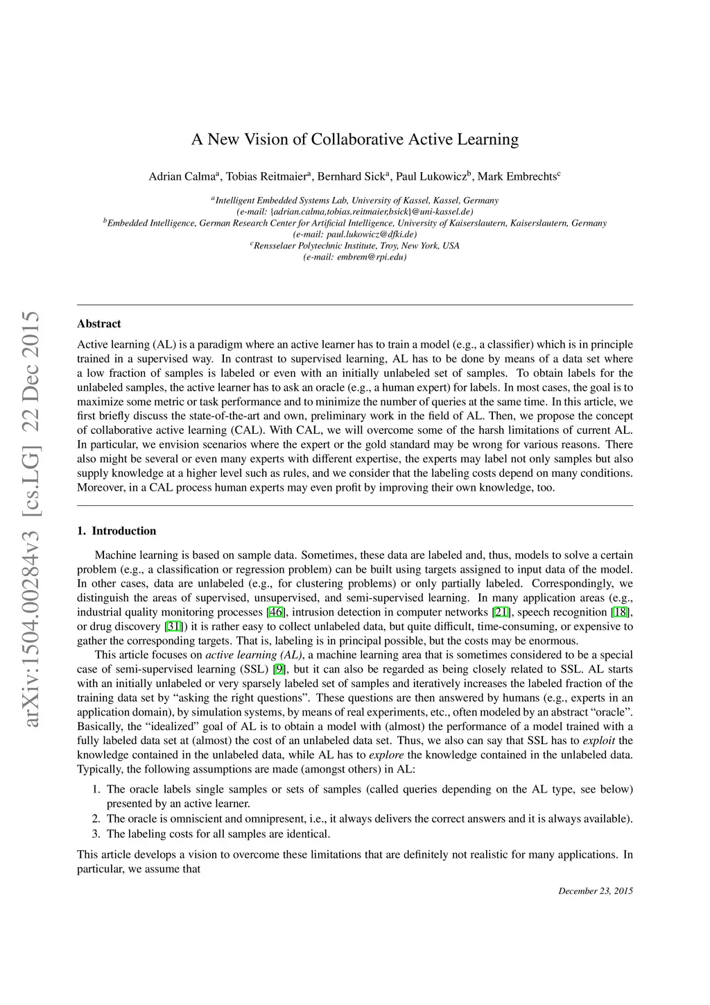 Active learning (AL) is a learning paradigm where an active learner has to train a model (e.g., a classifier) which is in principal trained in a supervised way, but in AL it has to be done by means of a data set with initially unlabeled samples. To get labels for these samples, the active learner has to ask an oracle (e.g., a human expert) for labels. The goal is to maximize the performance of the model and to minimize the number of queries at the same time. In this article, we first briefly discuss the state of the art and own, preliminary work in the field of AL. Then, we propose the concept of collaborative active learning (CAL). With CAL, we will overcome some of the harsh limitations of current AL. In particular, we envision scenarios where an expert may be wrong for various reasons, there might be several or even many experts with different expertise, the experts may label not only samples but also knowledge at a higher level such as rules, and we consider that the labeling costs depend on many conditions. Moreover, in a CAL process human experts will profit by improving their own knowledge, too.
