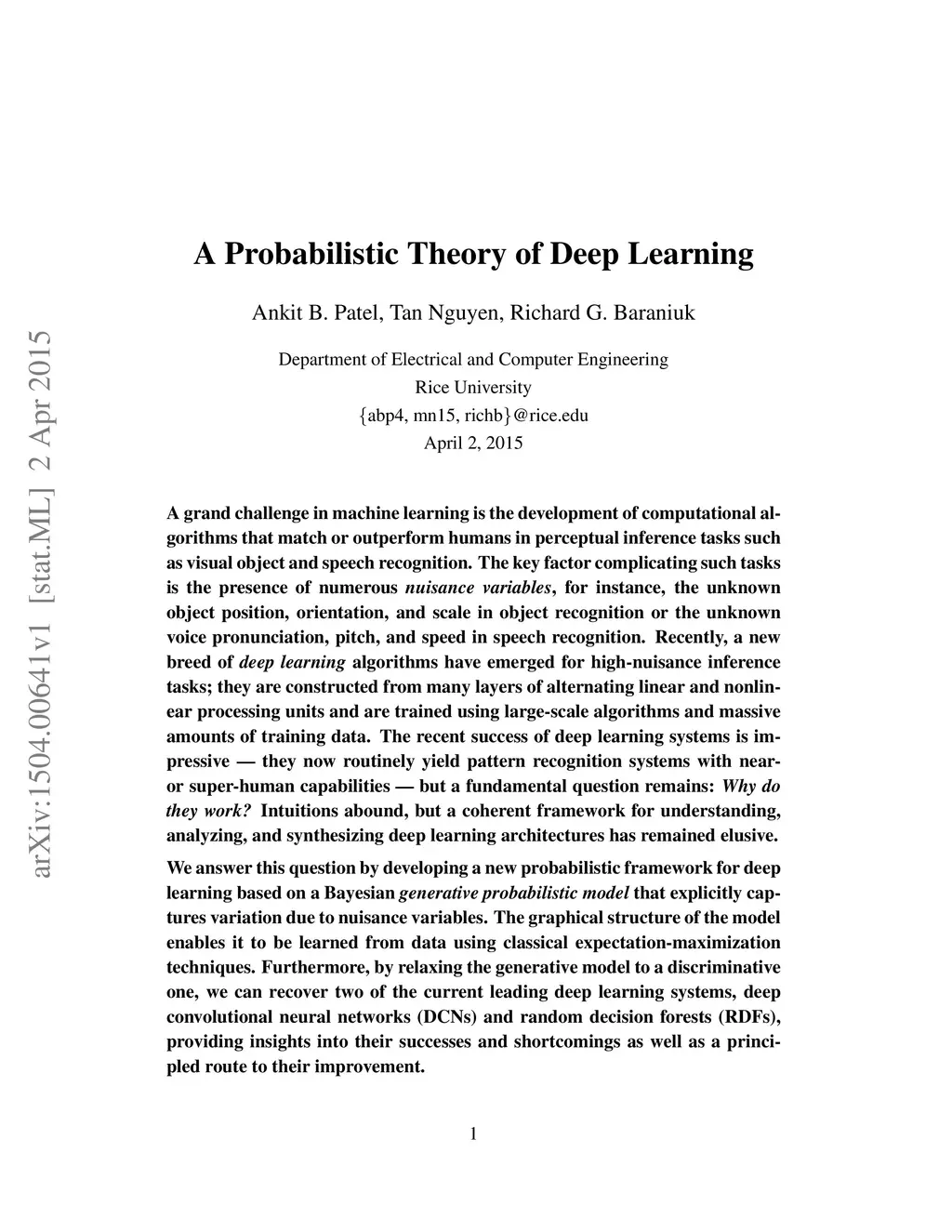 A grand challenge in machine learning is the development of computational algorithms that match or outperform humans in perceptual inference tasks that are complicated by nuisance variation. For instance, visual object recognition involves the unknown object position, orientation, and scale in object recognition while speech recognition involves the unknown voice pronunciation, pitch, and speed. Recently, a new breed of deep learning algorithms have emerged for high-nuisance inference tasks that routinely yield pattern recognition systems with near- or super-human capabilities. But a fundamental question remains: Why do they work? Intuitions abound, but a coherent framework for understanding, analyzing, and synthesizing deep learning architectures has remained elusive. We answer this question by developing a new probabilistic framework for deep learning based on the Deep Rendering Model: a generative probabilistic model that explicitly captures latent nuisance variation. By relaxing the generative model to a discriminative one, we can recover two of the current leading deep learning systems, deep convolutional neural networks and random decision forests, providing insights into their successes and shortcomings, as well as a principled route to their improvement.