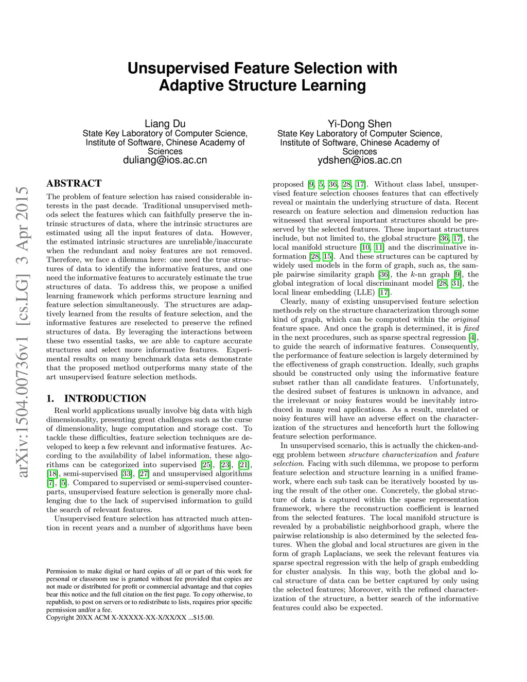Unsupervised Feature Selection with Adaptive Structure Learning