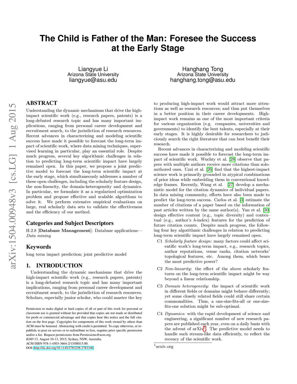 Understanding the dynamic mechanisms that drive the high-impact scientific work (e.g., research papers, patents) is a long-debated research topic and has many important implications, ranging from personal career development and recruitment search, to the jurisdiction of research resources. Recent advances in characterizing and modeling scientific success have made it possible to forecast the long-term impact of scientific work, where data mining techniques, supervised learning in particular, play an essential role. Despite much progress, several key algorithmic challenges in relation to predicting long-term scientific impact have largely remained open. In this paper, we propose a joint predictive model to forecast the long-term scientific impact at the early stage, which simultaneously addresses a number of these open challenges, including the scholarly feature design, the non-linearity, the domain-heterogeneity and dynamics. In particular, we formulate it as a regularized optimization problem and propose effective and scalable algorithms to solve it. We perform extensive empirical evaluations on large, real scholarly data sets to validate the effectiveness and the efficiency of our method.