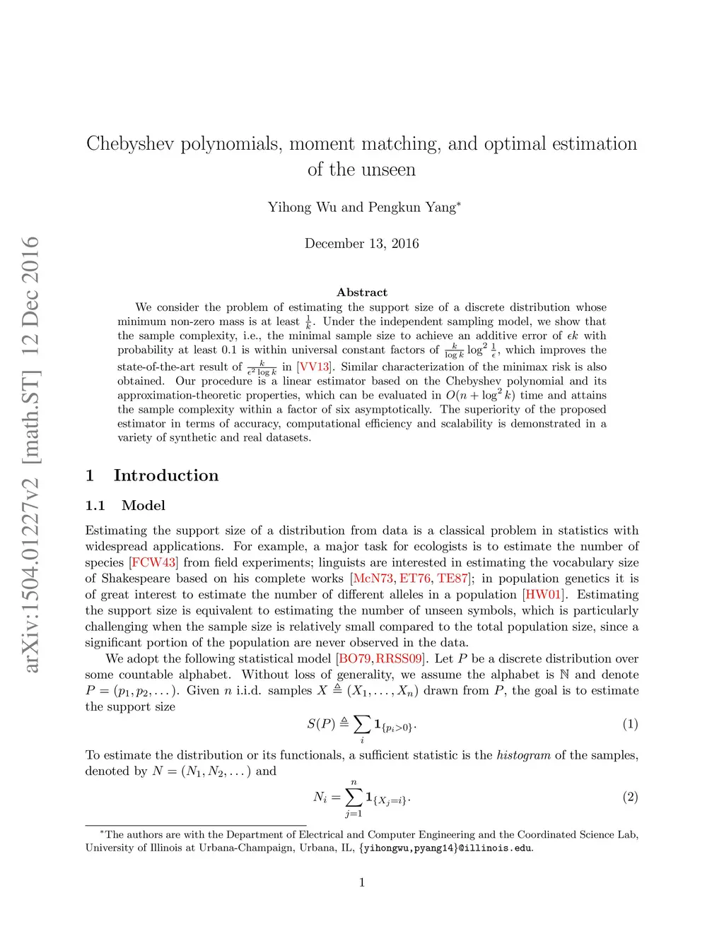 We consider the problem of estimating the support size of a discrete distribution whose minimum non-zero mass is at least $ \frac{1}{k}$. Under the independent sampling model, we show that the sample complexity, i.e., the minimal sample size to achieve an additive error of with probability at least 0.1 is within universal constant factors of $ \frac{k}{\log k}\log^2\frac{1}{\epsilon} $, which improves the state-of-the-art result of $ \frac{k}{\epsilon^2 \log k} $ in \cite{VV13}. Similar characterization of the minimax risk is also obtained. Our procedure is a linear estimator based on the Chebyshev polynomial and its approximation-theoretic properties, which can be evaluated in time and attains the sample complexity within a factor of six asymptotically. The superiority of the proposed estimator in terms of accuracy, computational efficiency and scalability is demonstrated in a variety of synthetic and real datasets.