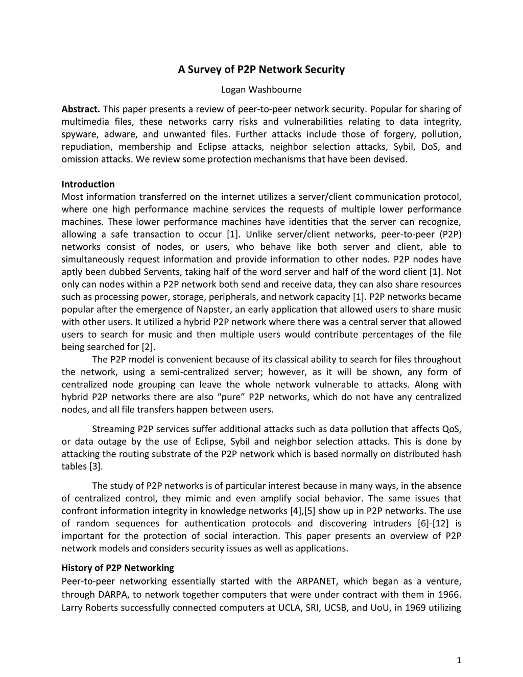 This paper presents a review of peer-to-peer network security. Popular for sharing of multimedia files, these networks carry risks and vulnerabilities relating to data integrity, spyware, adware, and unwanted files. Further attacks include those of forgery, pollution, repudiation, membership and Eclipse attacks, neighbor selection attacks, Sybil, DoS, and omission attacks. We review some protection mechanisms that have been devised.
