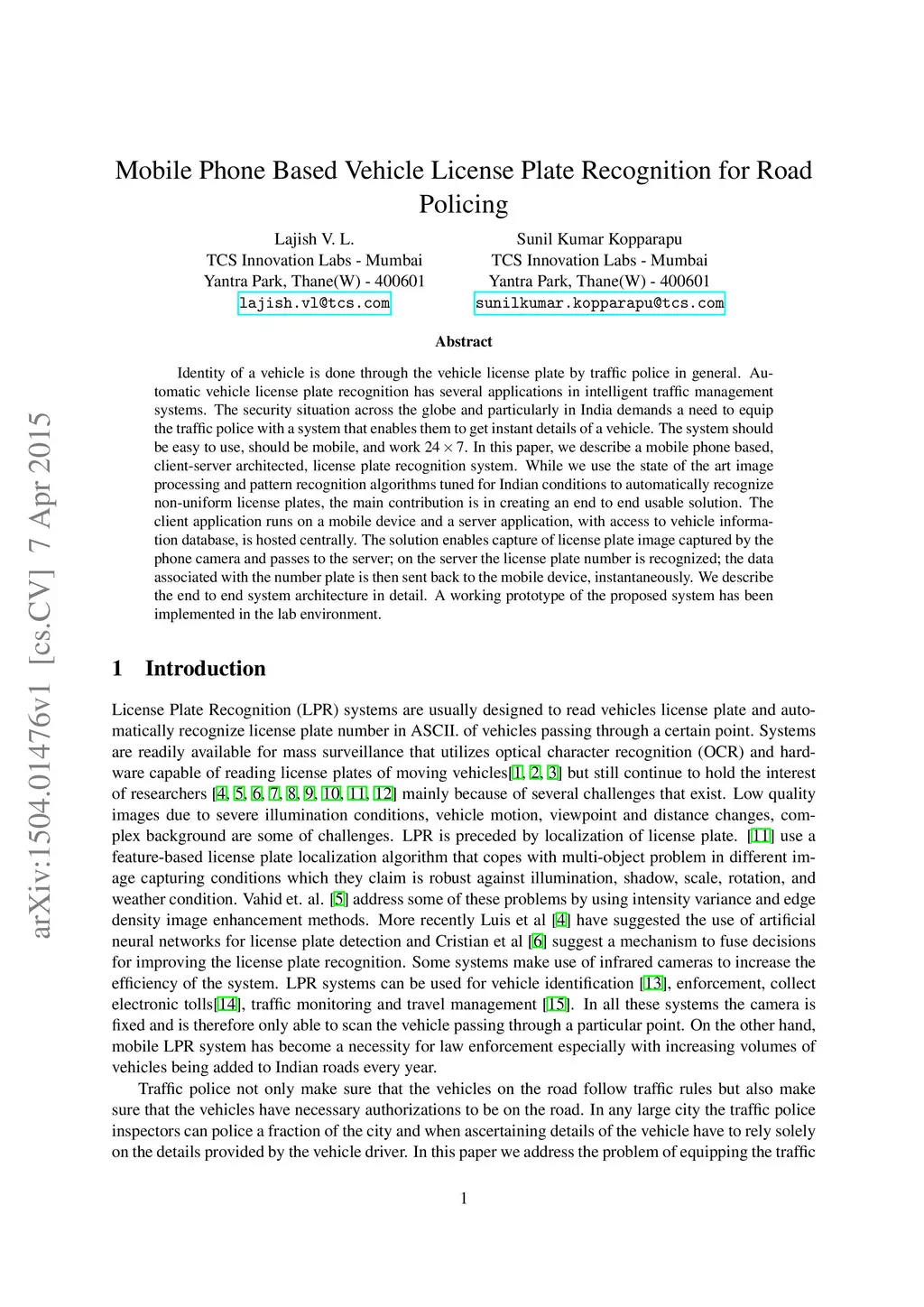 Identity of a vehicle is done through the vehicle license plate by traffic police in general. Au- tomatic vehicle license plate recognition has several applications in intelligent traffic management systems. The security situation across the globe and particularly in India demands a need to equip the traffic police with a system that enables them to get instant details of a vehicle. The system should be easy to use, should be mobile, and work 24 x 7. In this paper, we describe a mobile phone based, client-server architected, license plate recognition system. While we use the state of the art image processing and pattern recognition algorithms tuned for Indian conditions to automatically recognize non-uniform license plates, the main contribution is in creating an end to end usable solution. The client application runs on a mobile device and a server application, with access to vehicle information database, is hosted centrally. The solution enables capture of license plate image captured by the phone camera and passes to the server; on the server the license plate number is recognized; the data associated with the number plate is then sent back to the mobile device, instantaneously. We describe the end to end system architecture in detail. A working prototype of the proposed system has been implemented in the lab environment.
