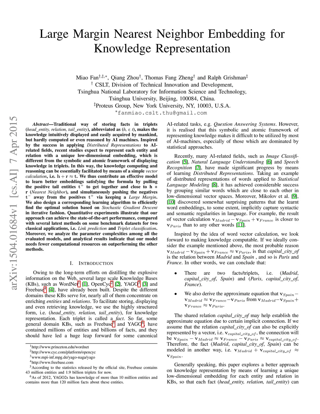 Traditional way of storing facts in triplets ({\it head\_entity, relation, tail\_entity}), abbreviated as ({\it h, r, t}), makes the knowledge intuitively displayed and easily acquired by mankind, but hardly computed or even reasoned by AI machines. Inspired by the success in applying {\it Distributed Representations} to AI-related fields, recent studies expect to represent each entity and relation with a unique low-dimensional embedding, which is different from the symbolic and atomic framework of displaying knowledge in triplets. In this way, the knowledge computing and reasoning can be essentially facilitated by means of a simple {\it vector calculation}, i.e. . We thus contribute an effective model to learn better embeddings satisfying the formula by pulling the positive tail entities to get together and close to {\bf h} + {\bf r} ({\it Nearest Neighbor}), and simultaneously pushing the negatives away from the positives via keeping a {\it Large Margin}. We also design a corresponding learning algorithm to efficiently find the optimal solution based on {\it Stochastic Gradient Descent} in iterative fashion. Quantitative experiments illustrate that our approach can achieve the state-of-the-art performance, compared with several latest methods on some benchmark datasets for two classical applications, i.e. {\it Link prediction} and {\it Triplet classification}. Moreover, we analyze the parameter complexities among all the evaluated models, and analytical results indicate that our model needs fewer computational resources on outperforming the other methods.