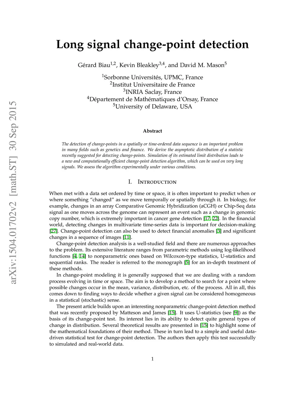 The detection of change-points in a spatially or time ordered data sequence is an important problem in many fields such as genetics and finance. We derive the asymptotic distribution of a statistic recently suggested for detecting change-points. Simulation of its estimated limit distribution leads to a new and computationally efficient change-point detection algorithm, which can be used on very long signals. We assess the algorithm via simulations and on previously benchmarked real-world data sets.