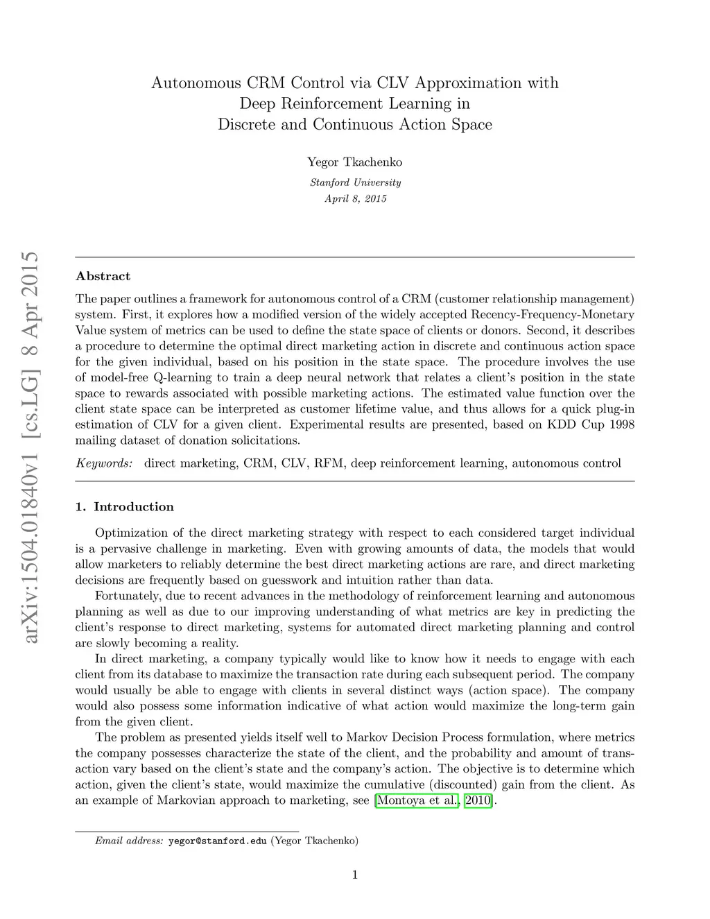 The paper outlines a framework for autonomous control of a CRM (customer relationship management) system. First, it explores how a modified version of the widely accepted Recency-Frequency-Monetary Value system of metrics can be used to define the state space of clients or donors. Second, it describes a procedure to determine the optimal direct marketing action in discrete and continuous action space for the given individual, based on his position in the state space. The procedure involves the use of model-free Q-learning to train a deep neural network that relates a client's position in the state space to rewards associated with possible marketing actions. The estimated value function over the client state space can be interpreted as customer lifetime value, and thus allows for a quick plug-in estimation of CLV for a given client. Experimental results are presented, based on KDD Cup 1998 mailing dataset of donation solicitations.