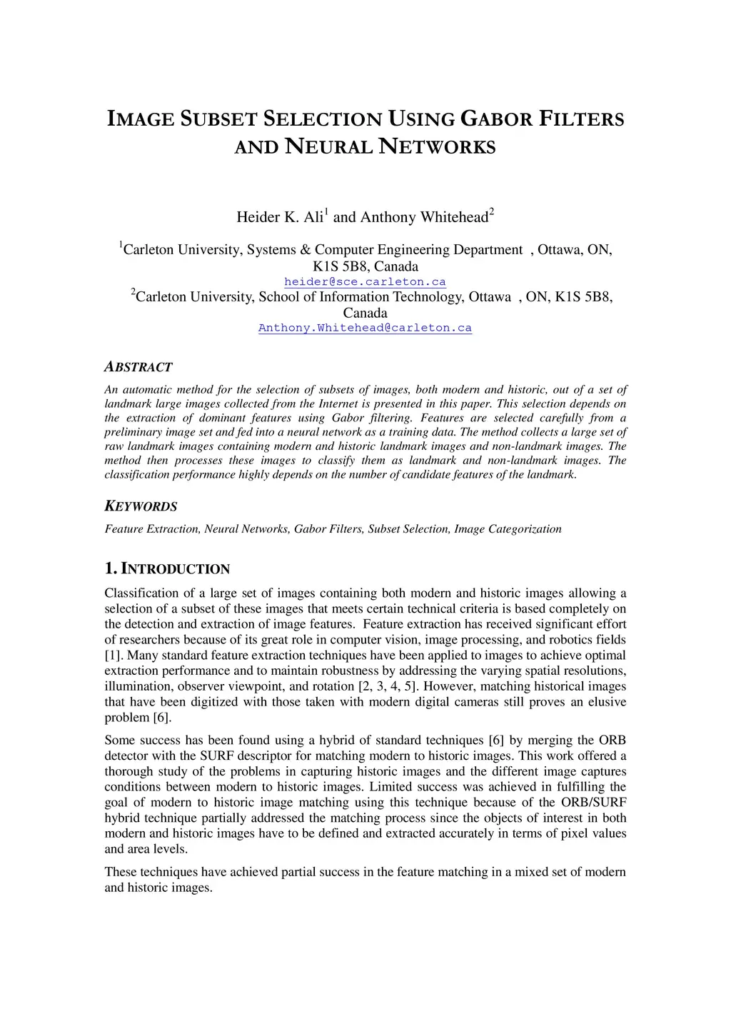 An automatic method for the selection of subsets of images, both modern and historic, out of a set of landmark large images collected from the Internet is presented in this paper. This selection depends on the extraction of dominant features using Gabor filtering. Features are selected carefully from a preliminary image set and fed into a neural network as a training data. The method collects a large set of raw landmark images containing modern and historic landmark images and non-landmark images. The method then processes these images to classify them as landmark and non-landmark images. The classification performance highly depends on the number of candidate features of the landmark.