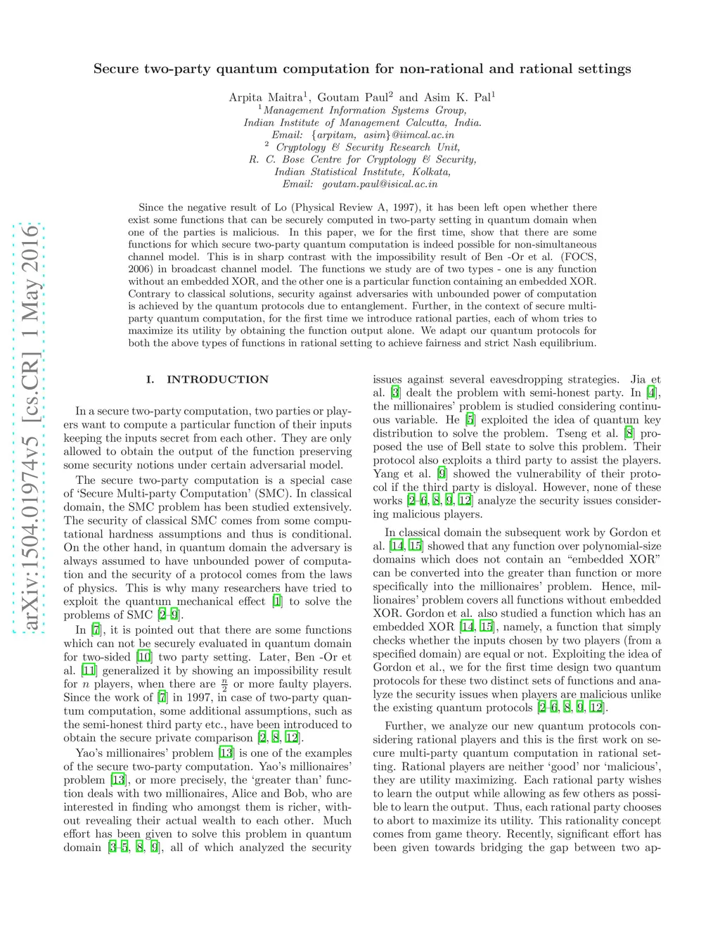 Since the negative result of Lo (Physical Review A, 1997), it has been left open whether there exist some functions that can be securely computed in two-party setting in quantum domain when one of the parties is malicious. In this paper, we for the first time, show that there are some functions for which secure two-party quantum computation is indeed possible for non-simultaneous channel model. This is in sharp contrast with the impossibility result of Ben -Or et al. (FOCS, 2006) in broadcast channel model. The functions we study are of two types - one is any function without an embedded XOR, and the other one is a particular function containing an embedded XOR. Contrary to classical solutions, security against adversaries with unbounded power of computation is achieved by the quantum protocols due to entanglement. Further, in the context of secure multi-party quantum computation, for the first time we introduce rational parties, each of whom tries to maximize its utility by obtaining the function output alone. We adapt our quantum protocols for both the above types of functions in rational setting to achieve fairness and strict Nash equilibrium.