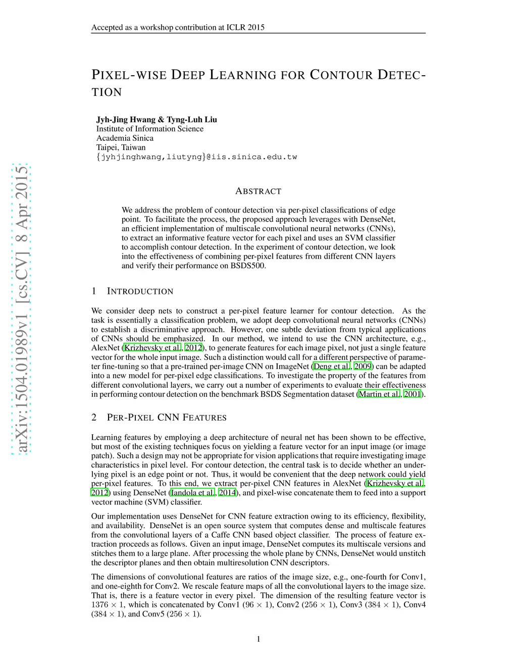 We address the problem of contour detection via per-pixel classifications of edge point. To facilitate the process, the proposed approach leverages with DenseNet, an efficient implementation of multiscale convolutional neural networks (CNNs), to extract an informative feature vector for each pixel and uses an SVM classifier to accomplish contour detection. In the experiment of contour detection, we look into the effectiveness of combining per-pixel features from different CNN layers and verify their performance on BSDS500.