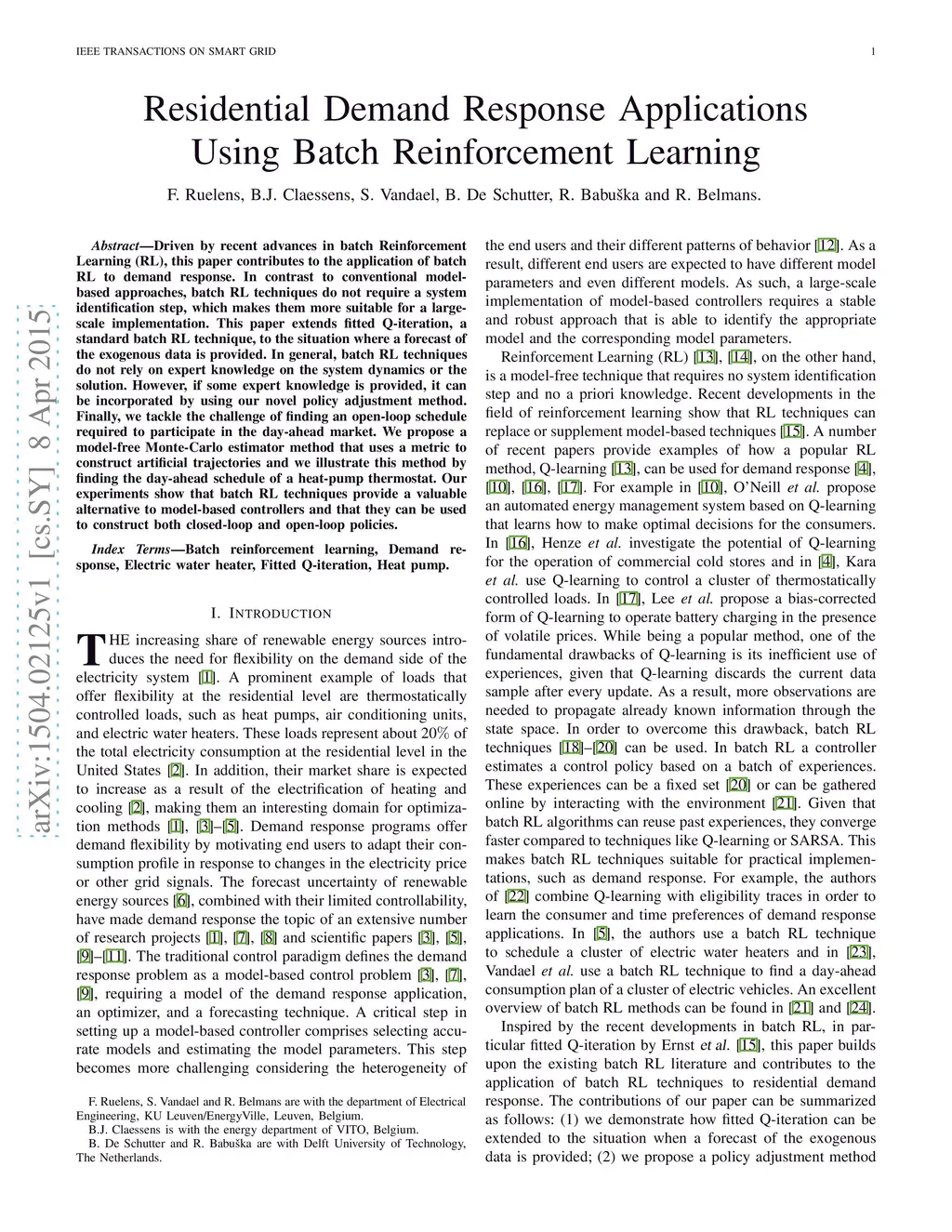 Driven by recent advances in batch Reinforcement Learning (RL), this paper contributes to the application of batch RL to demand response. In contrast to conventional model-based approaches, batch RL techniques do not require a system identification step, which makes them more suitable for a large-scale implementation. This paper extends fitted Q-iteration, a standard batch RL technique, to the situation where a forecast of the exogenous data is provided. In general, batch RL techniques do not rely on expert knowledge on the system dynamics or the solution. However, if some expert knowledge is provided, it can be incorporated by using our novel policy adjustment method. Finally, we tackle the challenge of finding an open-loop schedule required to participate in the day-ahead market. We propose a model-free Monte-Carlo estimator method that uses a metric to construct artificial trajectories and we illustrate this method by finding the day-ahead schedule of a heat-pump thermostat. Our experiments show that batch RL techniques provide a valuable alternative to model-based controllers and that they can be used to construct both closed-loop and open-loop policies.