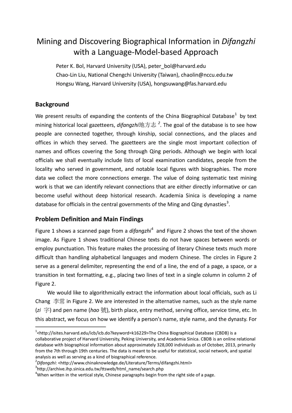 We present results of expanding the contents of the China Biographical Database by text mining historical local gazetteers, difangzhi. The goal of the database is to see how people are connected together, through kinship, social connections, and the places and offices in which they served. The gazetteers are the single most important collection of names and offices covering the Song through Qing periods. Although we begin with local officials we shall eventually include lists of local examination candidates, people from the locality who served in government, and notable local figures with biographies. The more data we collect the more connections emerge. The value of doing systematic text mining work is that we can identify relevant connections that are either directly informative or can become useful without deep historical research. Academia Sinica is developing a name database for officials in the central governments of the Ming and Qing dynasties.