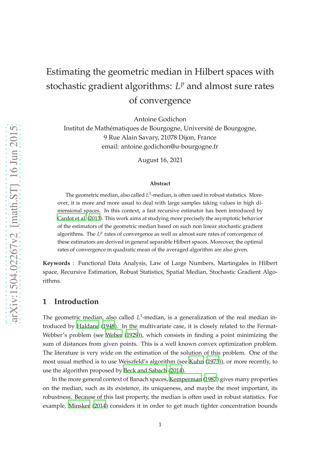 The geometric median, also called -median, is often used in robust statistics. Moreover, it is more and more usual to deal with large samples taking values in high dimensional spaces. In this context, a fast recursive estimator has been introduced by Cardot, Cenac and Zitt. This work aims at studying more precisely the asymptotic behavior of the estimators of the geometric median based on such non linear stochastic gradient algorithms. The rates of convergence as well as almost sure rates of convergence of these estimators are derived in general separable Hilbert spaces. Moreover, the optimal rate of convergence in quadratic mean of the averaged algorithm is also given.