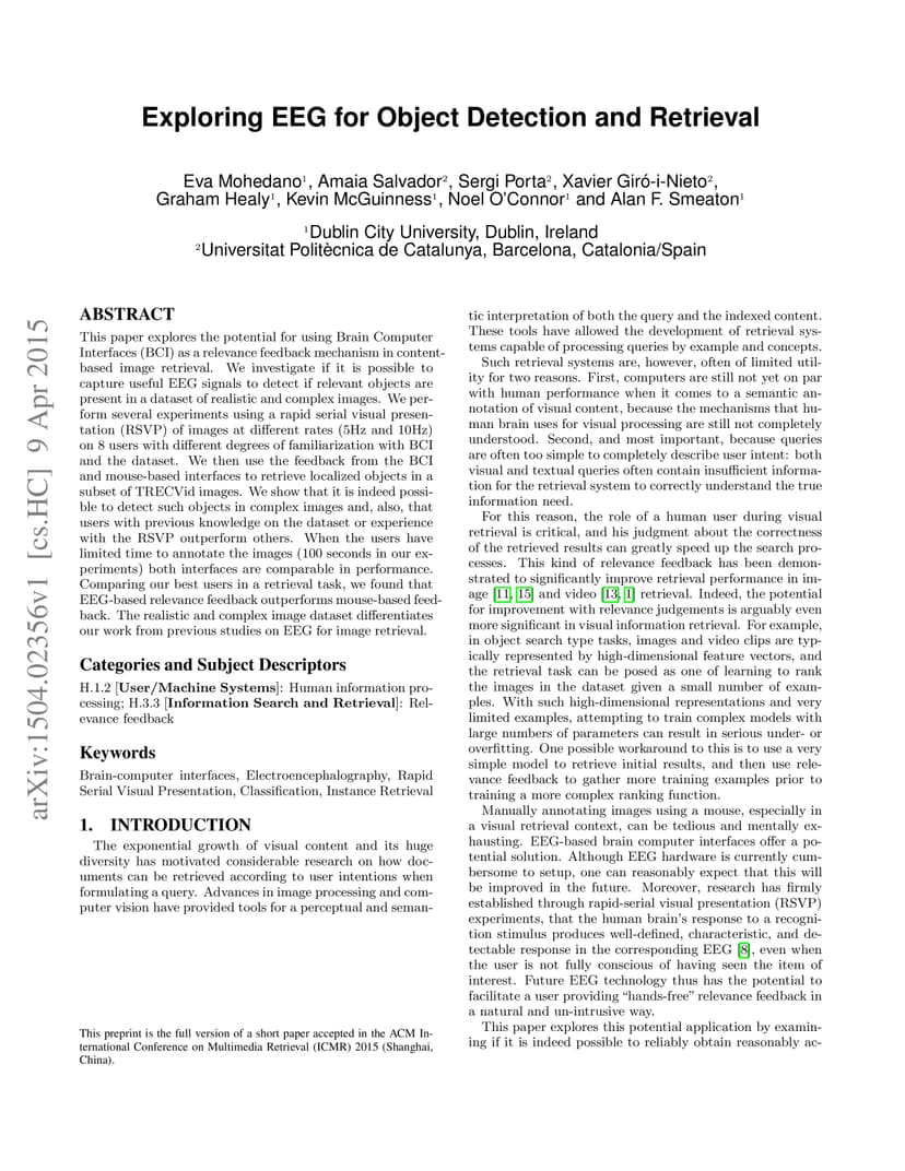 This paper explores the potential for using Brain Computer Interfaces (BCI) as a relevance feedback mechanism in content-based image retrieval. We investigate if it is possible to capture useful EEG signals to detect if relevant objects are present in a dataset of realistic and complex images. We perform several experiments using a rapid serial visual presentation (RSVP) of images at different rates (5Hz and 10Hz) on 8 users with different degrees of familiarization with BCI and the dataset. We then use the feedback from the BCI and mouse-based interfaces to retrieve localized objects in a subset of TRECVid images. We show that it is indeed possible to detect such objects in complex images and, also, that users with previous knowledge on the dataset or experience with the RSVP outperform others. When the users have limited time to annotate the images (100 seconds in our experiments) both interfaces are comparable in performance. Comparing our best users in a retrieval task, we found that EEG-based relevance feedback outperforms mouse-based feedback. The realistic and complex image dataset differentiates our work from previous studies on EEG for image retrieval.