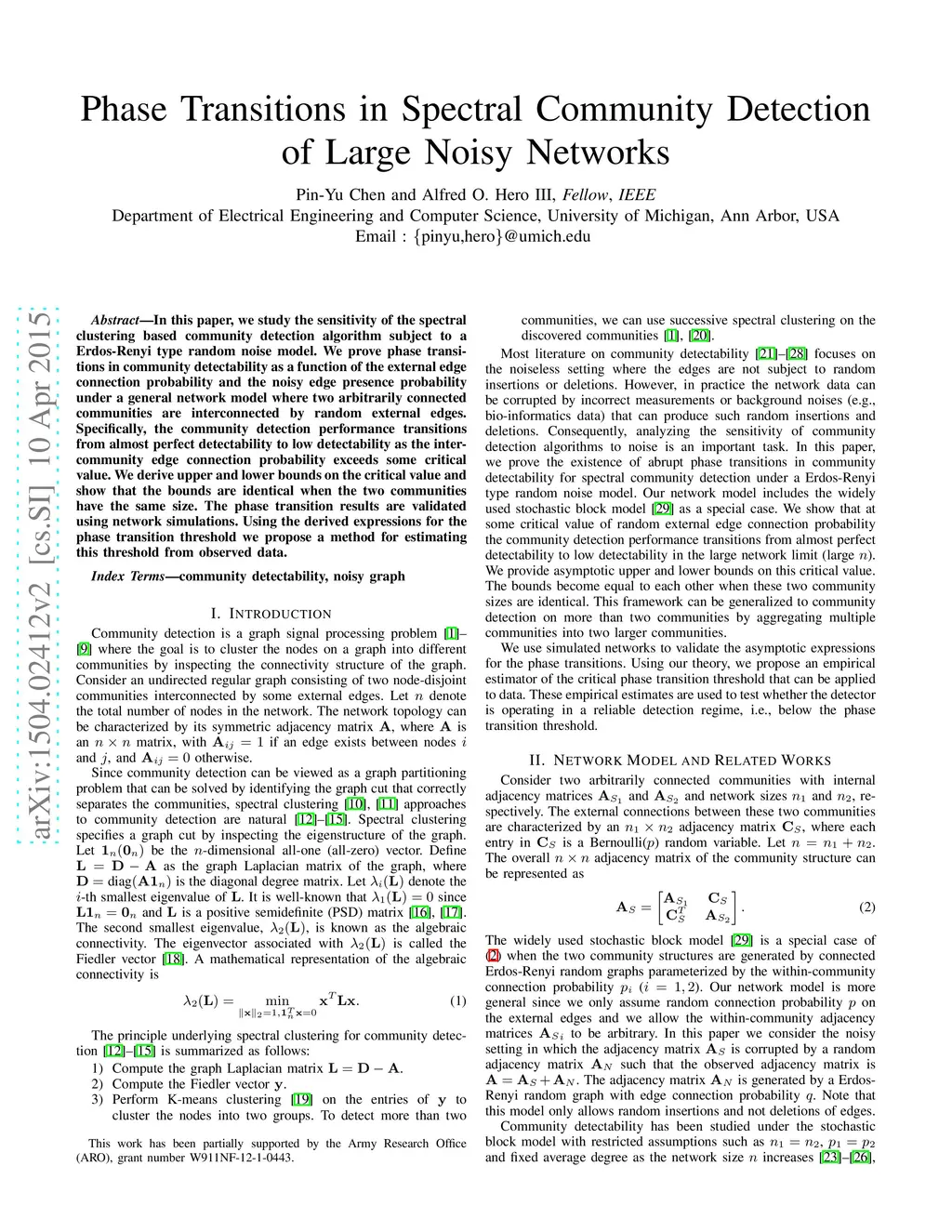 In this paper, we study the sensitivity of the spectral clustering based community detection algorithm subject to a Erdos-Renyi type random noise model. We prove phase transitions in community detectability as a function of the external edge connection probability and the noisy edge presence probability under a general network model where two arbitrarily connected communities are interconnected by random external edges. Specifically, the community detection performance transitions from almost perfect detectability to low detectability as the inter-community edge connection probability exceeds some critical value. We derive upper and lower bounds on the critical value and show that the bounds are identical when the two communities have the same size. The phase transition results are validated using network simulations. Using the derived expressions for the phase transition threshold we propose a method for estimating this threshold from observed data.