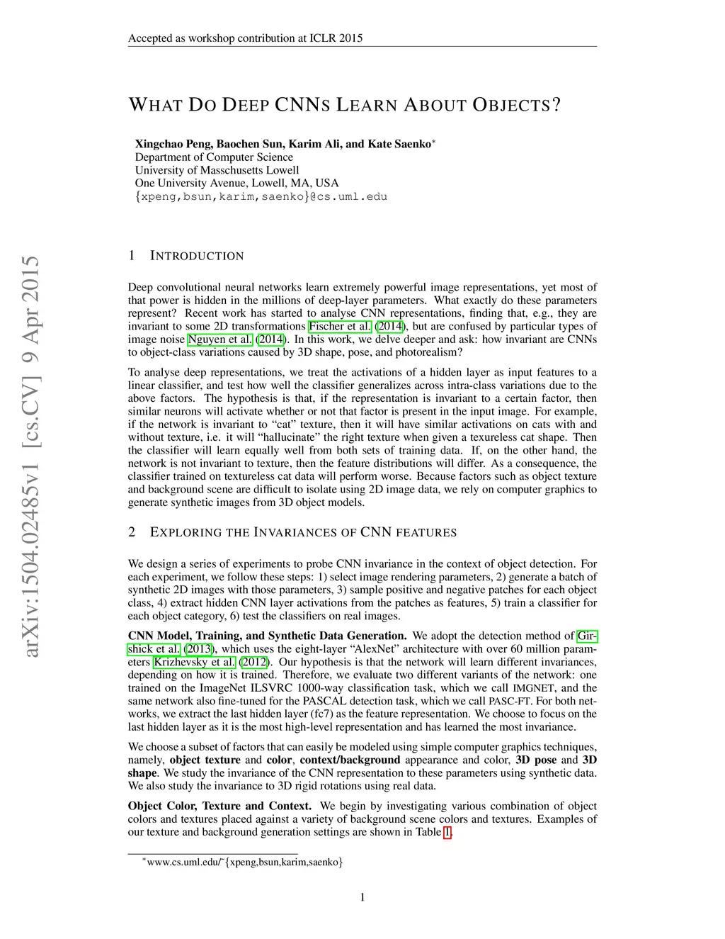 Deep convolutional neural networks learn extremely powerful image representations, yet most of that power is hidden in the millions of deep-layer parameters. What exactly do these parameters represent? Recent work has started to analyse CNN representations, finding that, e.g., they are invariant to some 2D transformations Fischer et al. (2014), but are confused by particular types of image noise Nguyen et al. (2014). In this work, we delve deeper and ask: how invariant are CNNs to object-class variations caused by 3D shape, pose, and photorealism?