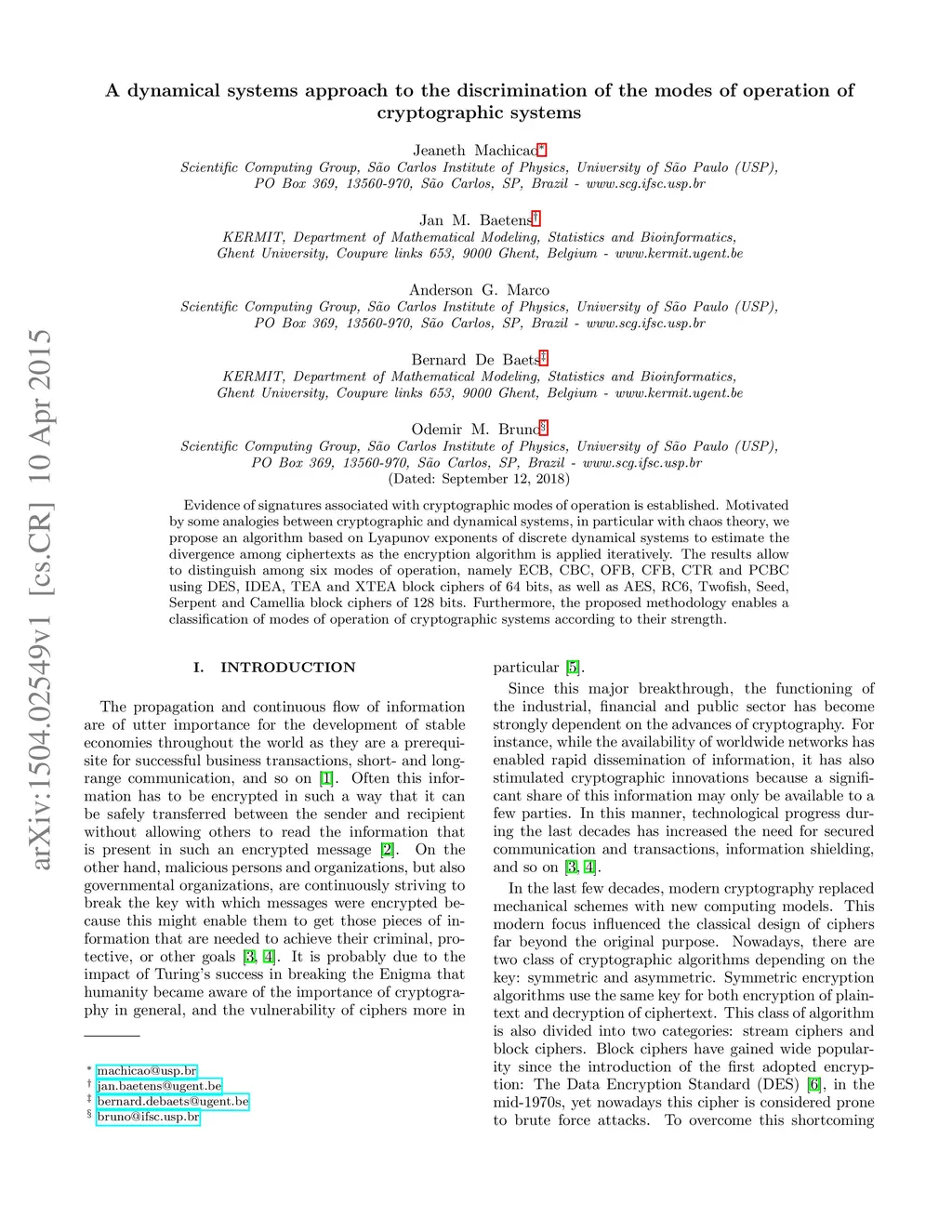Evidence of signatures associated with cryptographic modes of operation is established. Motivated by some analogies between cryptographic and dynamical systems, in particular with chaos theory, we propose an algorithm based on Lyapunov exponents of discrete dynamical systems to estimate the divergence among ciphertexts as the encryption algorithm is applied iteratively. The results allow to distinguish among six modes of operation, namely ECB, CBC, OFB, CFB, CTR and PCBC using DES, IDEA, TEA and XTEA block ciphers of 64 bits, as well as AES, RC6, Twofish, Seed, Serpent and Camellia block ciphers of 128 bits. Furthermore, the proposed methodology enables a classification of modes of operation of cryptographic systems according to their strength.