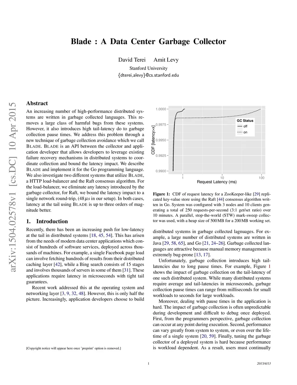 An increasing number of high-performance distributed systems are written in garbage collected languages. This removes a large class of harmful bugs from these systems. However, it also introduces high tail-latency do to garbage collection pause times. We address this problem through a new technique of garbage collection avoidance which we call Blade. Blade is an API between the collector and application developer that allows developers to leverage existing failure recovery mechanisms in distributed systems to coordinate collection and bound the latency impact. We describe Blade and implement it for the Go programming language. We also investigate two different systems that utilize Blade, a HTTP load-balancer and the Raft consensus algorithm. For the load-balancer, we eliminate any latency introduced by the garbage collector, for Raft, we bound the latency impact to a single network round-trip, (48 {\mu}s in our setup). In both cases, latency at the tail using Blade is up to three orders of magnitude better.