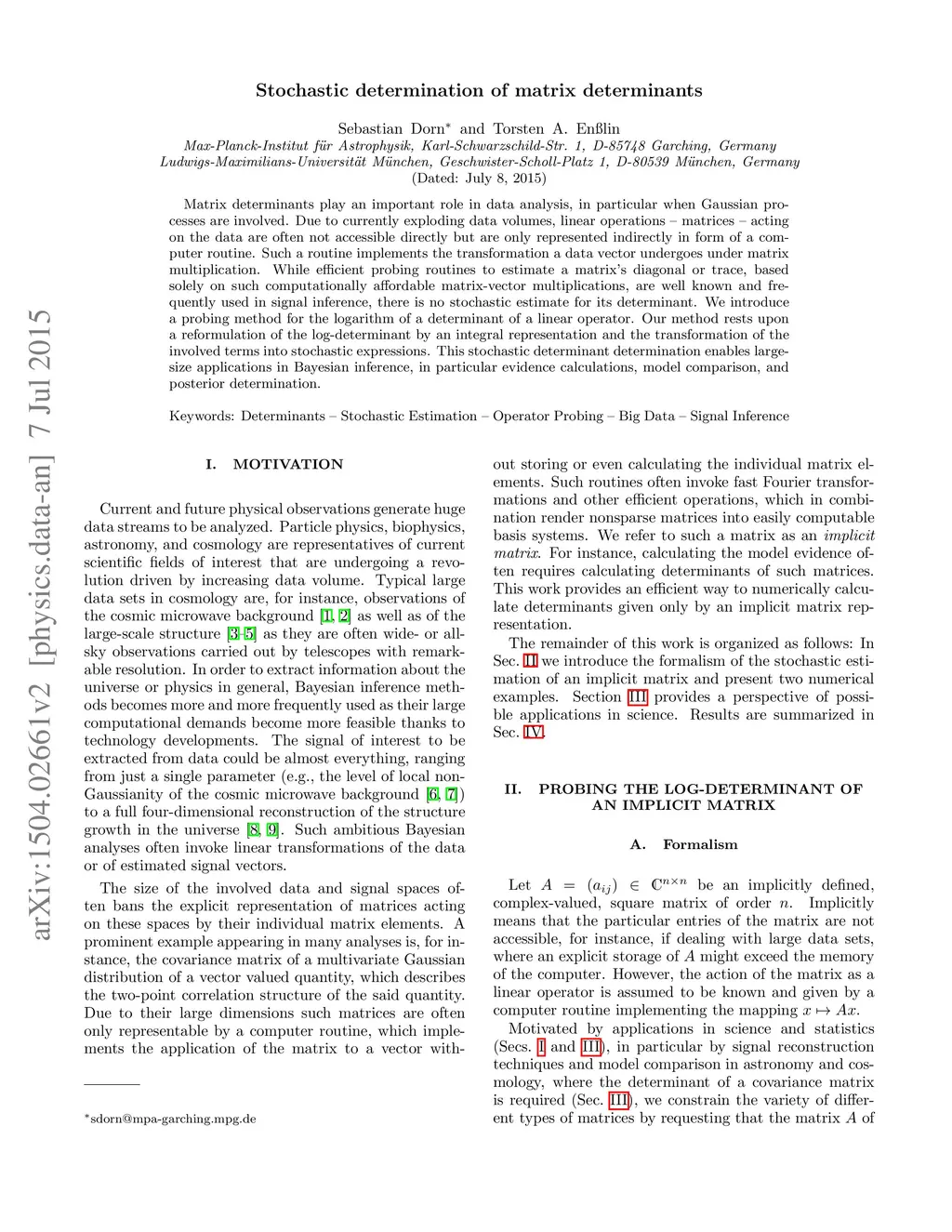 Matrix determinants play an important role in data analysis, in particular when Gaussian processes are involved. Due to currently exploding data volumes, linear operations - matrices - acting on the data are often not accessible directly but are only represented indirectly in form of a computer routine. Such a routine implements the transformation a data vector undergoes under matrix multiplication. While efficient probing routines to estimate a matrix's diagonal or trace, based solely on such computationally affordable matrix-vector multiplications, are well known and frequently used in signal inference, there is no stochastic estimate for its determinant. We introduce a probing method for the logarithm of a determinant of a linear operator. Our method rests upon a reformulation of the log-determinant by an integral representation and the transformation of the involved terms into stochastic expressions. This stochastic determinant determination enables large-size applications in Bayesian inference, in particular evidence calculations, model comparison, and posterior determination.
