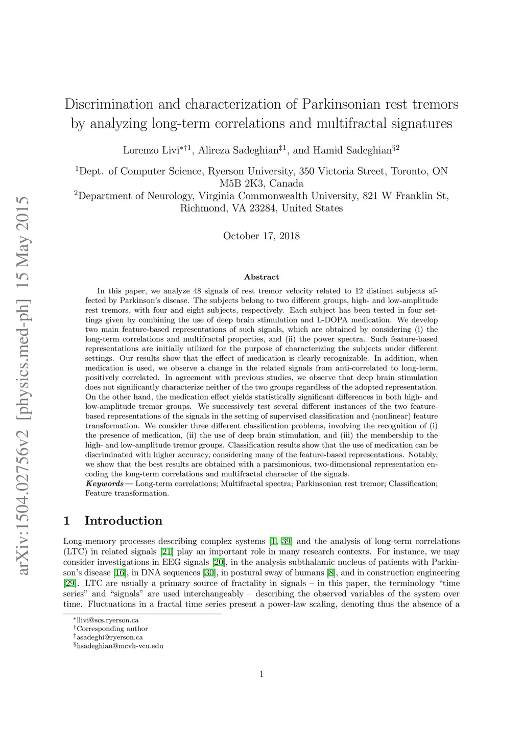 In this paper, we analyze 48 signals of rest tremor velocity related to 12 distinct subjects affected by Parkinson's disease. The subjects belong to two different groups, formed by four and eight subjects with, respectively, high- and low-amplitude rest tremors. Each subject is tested in four settings, given by combining the use of deep brain stimulation and L-DOPA medication. We develop two main feature-based representations of such signals, which are obtained by considering (i) the long-term correlations and multifractal properties, and (ii) the power spectra. The feature-based representations are initially utilized for the purpose of characterizing the subjects under different settings. In agreement with previous studies, we show that deep brain stimulation does not significantly characterize neither of the two groups, regardless of the adopted representation. On the other hand, the medication effect yields statistically significant differences in both high- and low-amplitude tremor groups. We successively test several different instances of the two feature-based representations of the signals in the setting of supervised classification and (nonlinear) feature transformation. We consider three different classification problems, involving the recognition of (i) the presence of medication, (ii) the use of deep brain stimulation, and (iii) the membership to the high- and low-amplitude tremor groups. Classification results show that the use of medication can be discriminated with higher accuracy, considering many of the feature-based representations. Notably, we show that the best results are obtained with a parsimonious, two-dimensional representation encoding the long-term correlations and multifractal character of the signals.