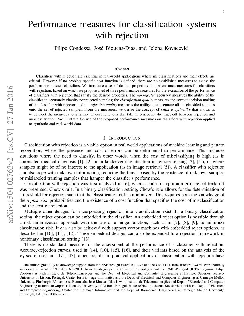 Performance measures for classification systems with rejection