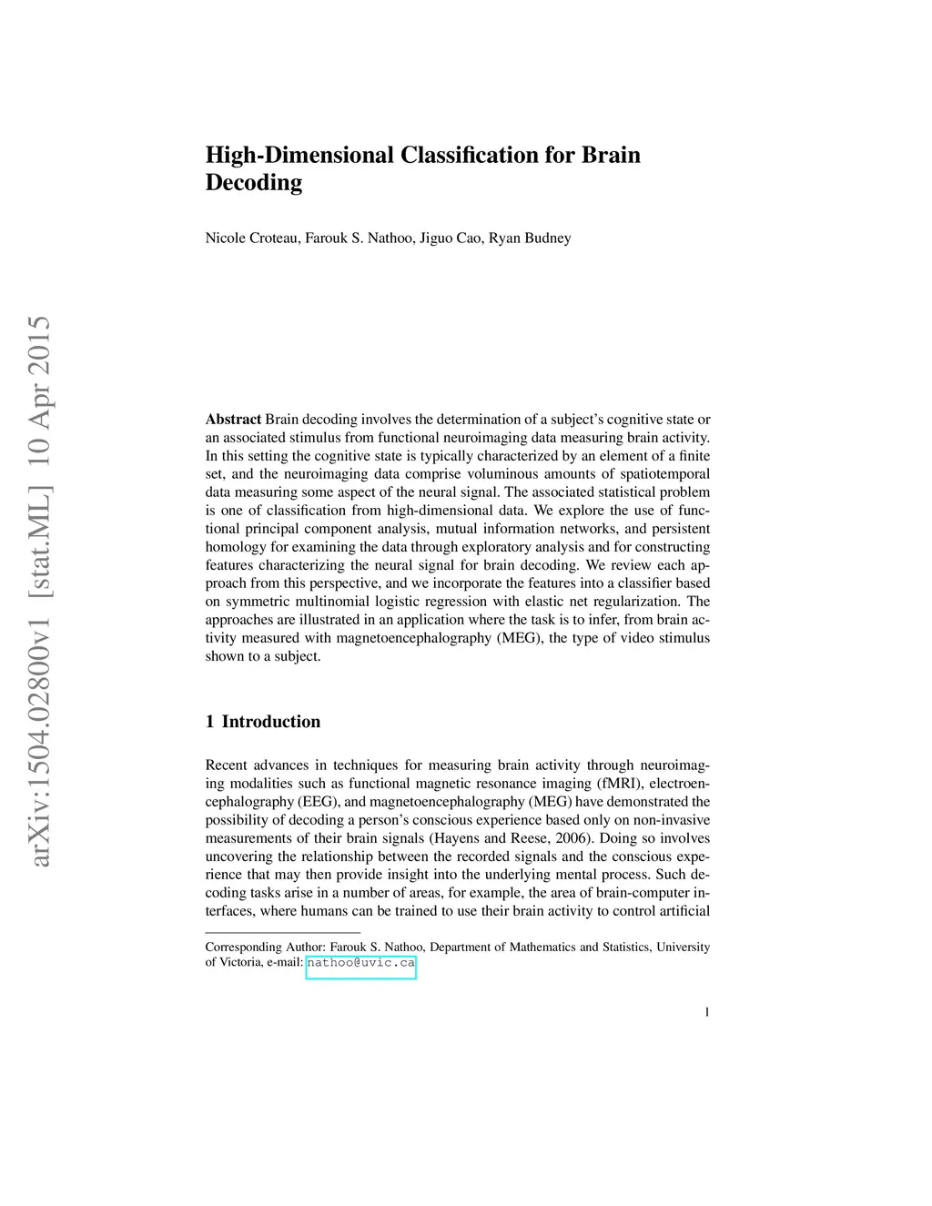 Brain decoding involves the determination of a subject's cognitive state or an associated stimulus from functional neuroimaging data measuring brain activity. In this setting the cognitive state is typically characterized by an element of a finite set, and the neuroimaging data comprise voluminous amounts of spatiotemporal data measuring some aspect of the neural signal. The associated statistical problem is one of classification from high-dimensional data. We explore the use of functional principal component analysis, mutual information networks, and persistent homology for examining the data through exploratory analysis and for constructing features characterizing the neural signal for brain decoding. We review each approach from this perspective, and we incorporate the features into a classifier based on symmetric multinomial logistic regression with elastic net regularization. The approaches are illustrated in an application where the task is to infer, from brain activity measured with magnetoencephalography (MEG), the type of video stimulus shown to a subject.