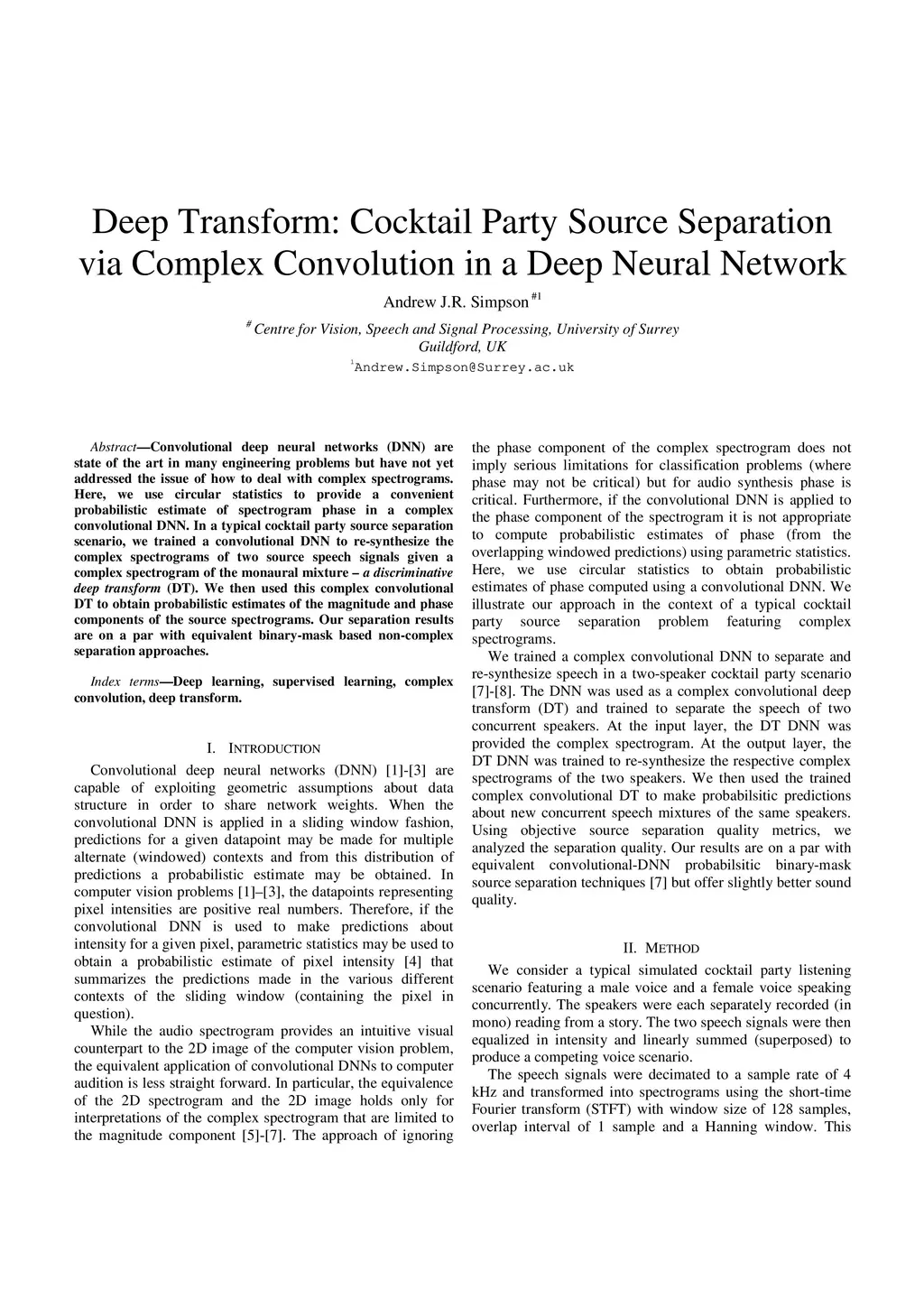 Convolutional deep neural networks (DNN) are state of the art in many engineering problems but have not yet addressed the issue of how to deal with complex spectrograms. Here, we use circular statistics to provide a convenient probabilistic estimate of spectrogram phase in a complex convolutional DNN. In a typical cocktail party source separation scenario, we trained a convolutional DNN to re-synthesize the complex spectrograms of two source speech signals given a complex spectrogram of the monaural mixture - a discriminative deep transform (DT). We then used this complex convolutional DT to obtain probabilistic estimates of the magnitude and phase components of the source spectrograms. Our separation results are on a par with equivalent binary-mask based non-complex separation approaches.