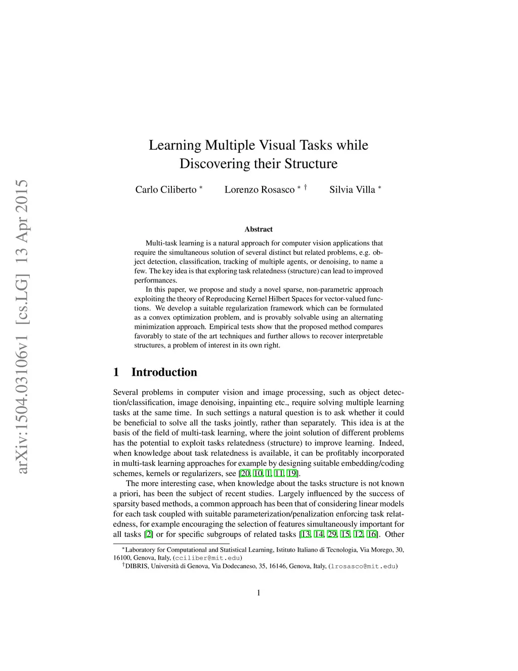 Multi-task learning is a natural approach for computer vision applications that require the simultaneous solution of several distinct but related problems, e.g. object detection, classification, tracking of multiple agents, or denoising, to name a few. The key idea is that exploring task relatedness (structure) can lead to improved performances. In this paper, we propose and study a novel sparse, non-parametric approach exploiting the theory of Reproducing Kernel Hilbert Spaces for vector-valued functions. We develop a suitable regularization framework which can be formulated as a convex optimization problem, and is provably solvable using an alternating minimization approach. Empirical tests show that the proposed method compares favorably to state of the art techniques and further allows to recover interpretable structures, a problem of interest in its own right.