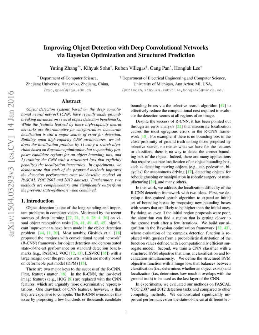 Object detection systems based on the deep convolutional neural network (CNN) have recently made ground- breaking advances on several object detection benchmarks. While the features learned by these high-capacity neural networks are discriminative for categorization, inaccurate localization is still a major source of error for detection. Building upon high-capacity CNN architectures, we address the localization problem by 1) using a search algorithm based on Bayesian optimization that sequentially proposes candidate regions for an object bounding box, and 2) training the CNN with a structured loss that explicitly penalizes the localization inaccuracy. In experiments, we demonstrated that each of the proposed methods improves the detection performance over the baseline method on PASCAL VOC 2007 and 2012 datasets. Furthermore, two methods are complementary and significantly outperform the previous state-of-the-art when combined.