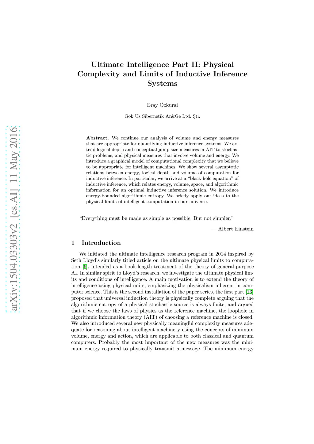 We continue our analysis of volume and energy measures that are appropriate for quantifying inductive inference systems. We extend logical depth and conceptual jump size measures in AIT to stochastic problems, and physical measures that involve volume and energy. We introduce a graphical model of computational complexity that we believe to be appropriate for intelligent machines. We show several asymptotic relations between energy, logical depth and volume of computation for inductive inference. In particular, we arrive at a "black-hole equation" of inductive inference, which relates energy, volume, space, and algorithmic information for an optimal inductive inference solution. We introduce energy-bounded algorithmic entropy. We briefly apply our ideas to the physical limits of intelligent computation in our universe.